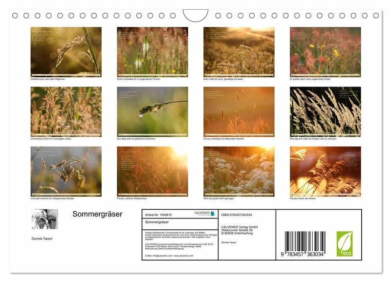 QUALITÄT - Hochwertiger Fotokalender mit 12 wunderschönen Motiven auf lichtbeständigem Bilderdruckpapier, robuste Spiralbindung mit Aufhängebügel.NACHHALTIG - deutliche Abfallreduzierung durch bedarfsgerechte Einzelstückfertigung, umweltfreundliches FSC-zertifiziertes Papier, Produktion in Deutschland, klimabewusste Logistik.PERFEKTES GESCHENK - Kalender für Freunde und Familie, für Kinder und Erwachsene, jung und alt, zu Weihnachten, Geburtstag oder zwischendurch.VIELFALT - Bildkalender in verschiedenen Formaten, z.B. DIN A5, DIN A4, DIN A3 sowie DIN A2. Ob Naturmotiv, Gemälde oder Fotos, ideal für ein persönliches Wohlfühlambiente.Natur und Poesie im Einklang von Autor(in): Daniela Tapper