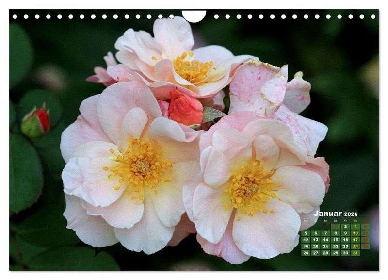 Januar: Zartrosa Rosenblüten mit roter Knospe