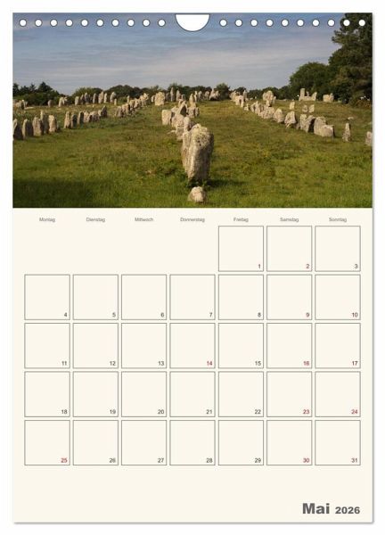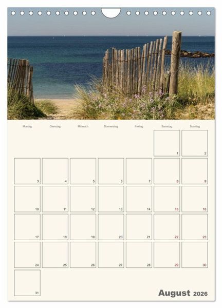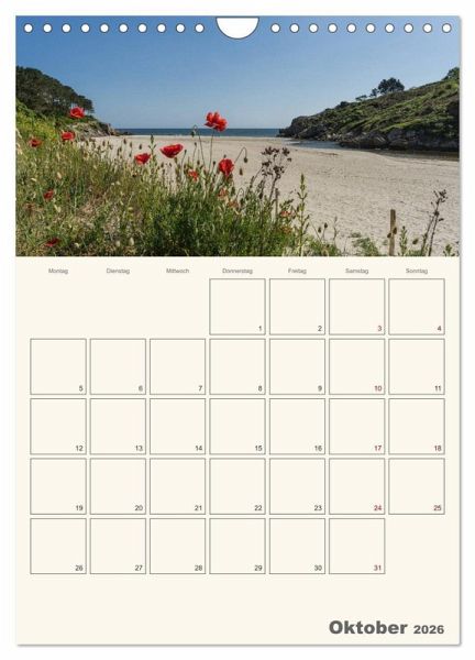 Die Bretagne ist bekannt für ihre abwechslungsreiche Landschaft. Am Meer wechseln sich sanfte Strände mit rauen Felsküsten ab und im Landesinneren landwirtschaftlich genutzte Flächen mit zauberhaften Wäldern. Der Kalender bietet einen Querschnitt durch diese Landschaftsformen und hilft Ihnen, Termine nicht zu vergessen.