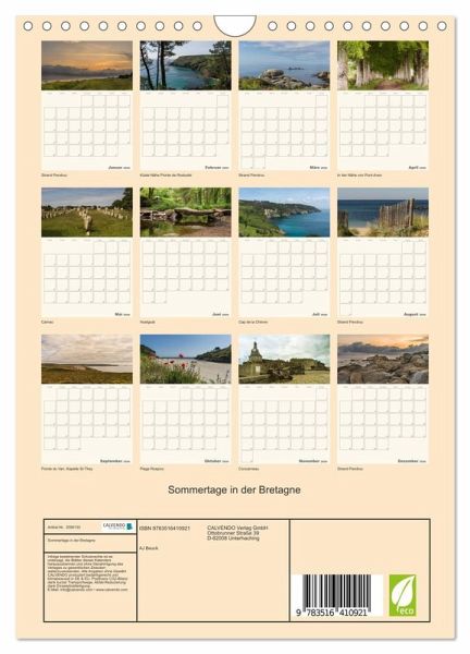 QUALITÄT - Hochwertiger Fotokalender mit 12 wunderschönen Motiven auf lichtbeständigem Bilderdruckpapier, robuste Spiralbindung mit Aufhängebügel.NACHHALTIG - deutliche Abfallreduzierung durch bedarfsgerechte Einzelstückfertigung, umweltfreundliches FSC-zertifiziertes Papier, Produktion in Deutschland, klimabewusste Logistik.PERFEKTES GESCHENK - Kalender für Freunde und Familie, für Kinder und Erwachsene, jung und alt, zu Weihnachten, Geburtstag oder zwischendurch.VIELFALT - Bildkalender in verschiedenen Formaten, z.B. DIN A5, DIN A4, DIN A3 sowie DIN A2. Ob Naturmotiv, Gemälde oder Fotos, ideal für ein persönliches Wohlfühlambiente.Schöner planen mit den Bildern der zauberhaften Bretagne von Autor(in): Angelika Beuck