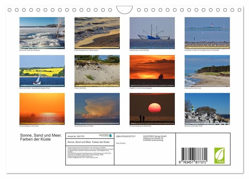 Die Farbpalette, die die Sonne zusammen mit Strand und Meer bietet, zählt zu den einzigartigen Naturereignissen in Deutschland und ist für viele Menschen mit Urlaubserinnerungen, Sehnsucht und einem Gefühl der Freiheit verbunden. Lassen Sie sich von den Bildern dieses Kalenders zum Träumen verführen.