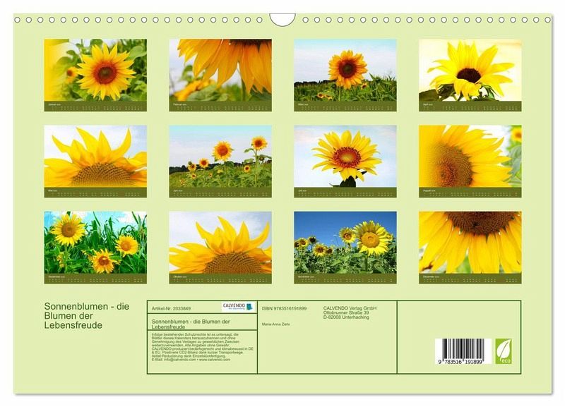 QUALITÄT - Hochwertiger Fotokalender mit 12 wunderschönen Motiven auf lichtbeständigem Bilderdruckpapier, robuste Spiralbindung mit Aufhängebügel.NACHHALTIG - deutliche Abfallreduzierung durch bedarfsgerechte Einzelstückfertigung, umweltfreundliches FSC-zertifiziertes Papier, Produktion in Deutschland, klimabewusste Logistik.PERFEKTES GESCHENK - Kalender für Freunde und Familie, für Kinder und Erwachsene, jung und alt, zu Weihnachten, Geburtstag oder zwischendurch.VIELFALT - Bildkalender in verschiedenen Formaten, z.B. DIN A5, DIN A4, DIN A3 sowie DIN A2. Ob Naturmotiv, Gemälde oder Fotos, ideal für ein persönliches Wohlfühlambiente.Bezaubernde Naturaufnahmen - Sonnenblumenfelder und Sonnenblumenmakros von Autor(in): Maria-Anna Ziehr