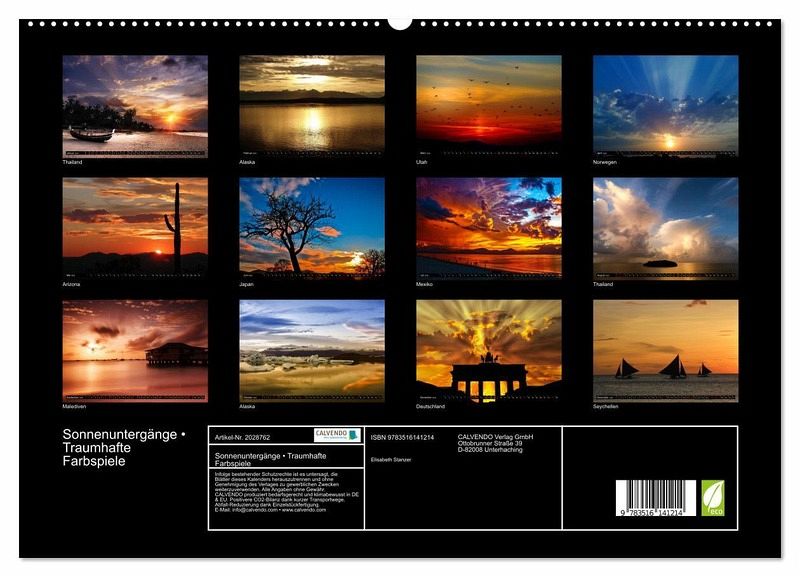 PREMIUM-LINIE - Brillanter Fotokalender mit 12 wunderschönen Motiven, Kunstdruck in Hochglanz in Museumsqualität.QUALITÄT - edle Materialien, stabile Rückwand mit 2 innovativen Einstecktaschen für eine optimale Präsentation an der Wand.NACHHALTIG - deutliche Abfallreduzierung durch bedarfsgerechte Einzelstückfertigung, umweltfreundliches FSC-zertifiziertes Papier, Produktion in Deutschland, klimabewusste Logistik.PERFEKTES GESCHENK - Kalender für Freunde und Familie, für Kinder und Erwachsene, jung und alt, zu Weihnachten, Geburtstag oder zwischendurch.Traumhafte Sonnenuntergänge und atemberaubende Farbenspiele der Natur von Autor(in): Elisabeth Stanzer