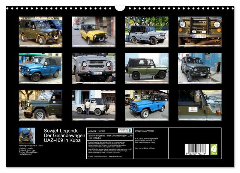 QUALITÄT - Hochwertiger Fotokalender mit 12 wunderschönen Motiven auf lichtbeständigem Bilderdruckpapier, robuste Spiralbindung mit Aufhängebügel.NACHHALTIG - deutliche Abfallreduzierung durch bedarfsgerechte Einzelstückfertigung, umweltfreundliches FSC-zertifiziertes Papier, Produktion in Deutschland, klimabewusste Logistik.PERFEKTES GESCHENK - Kalender für Freunde und Familie, für Kinder und Erwachsene, jung und alt, zu Weihnachten, Geburtstag oder zwischendurch.VIELFALT - Bildkalender in verschiedenen Formaten, z.B. DIN A5, DIN A4, DIN A3 sowie DIN A2. Ob Naturmotiv, Gemälde oder Fotos, ideal für ein persönliches Wohlfühlambiente.Der Geländewagen UAZ-469 aus Uljanowsk in Kuba von Autor(in): Henning von Loewis of Menar