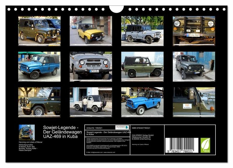 QUALITÄT - Hochwertiger Fotokalender mit 12 wunderschönen Motiven auf lichtbeständigem Bilderdruckpapier, robuste Spiralbindung mit Aufhängebügel.NACHHALTIG - deutliche Abfallreduzierung durch bedarfsgerechte Einzelstückfertigung, umweltfreundliches FSC-zertifiziertes Papier, Produktion in Deutschland, klimabewusste Logistik.PERFEKTES GESCHENK - Kalender für Freunde und Familie, für Kinder und Erwachsene, jung und alt, zu Weihnachten, Geburtstag oder zwischendurch.VIELFALT - Bildkalender in verschiedenen Formaten, z.B. DIN A5, DIN A4, DIN A3 sowie DIN A2. Ob Naturmotiv, Gemälde oder Fotos, ideal für ein persönliches Wohlfühlambiente.Der Geländewagen UAZ-469 aus Uljanowsk in Kuba von Autor(in): Henning von Loewis of Menar