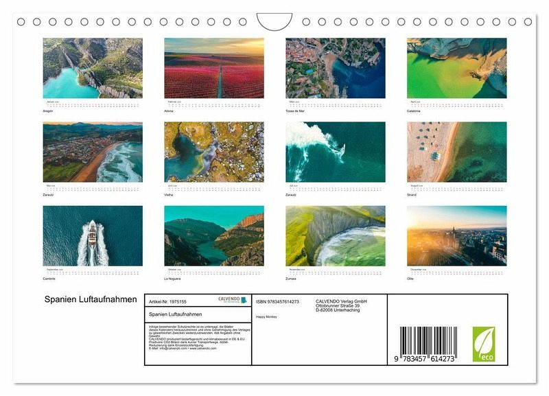 Dieser Kalender zeigt unbeschreiblich schöne Aufnahmen aus der Luft. Entdecken Sie Spanien aus einer ganz neuen Perspektive und lassen Sie sich von den 12 Aufnahmen verzaubern.