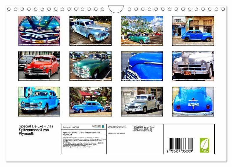 QUALITÄT - Hochwertiger Fotokalender mit 12 wunderschönen Motiven auf lichtbeständigem Bilderdruckpapier, robuste Spiralbindung mit Aufhängebügel.NACHHALTIG - deutliche Abfallreduzierung durch bedarfsgerechte Einzelstückfertigung, umweltfreundliches FSC-zertifiziertes Papier, Produktion in Deutschland, klimabewusste Logistik.PERFEKTES GESCHENK - Kalender für Freunde und Familie, für Kinder und Erwachsene, jung und alt, zu Weihnachten, Geburtstag oder zwischendurch.VIELFALT - Bildkalender in verschiedenen Formaten, z.B. DIN A5, DIN A4, DIN A3 sowie DIN A2. Ob Naturmotiv, Gemälde oder Fotos, ideal für ein persönliches Wohlfühlambiente.Der US-Oldtimer Plymouth Special Deluxe in Kuba von Autor(in): Henning von Loewis of Menar