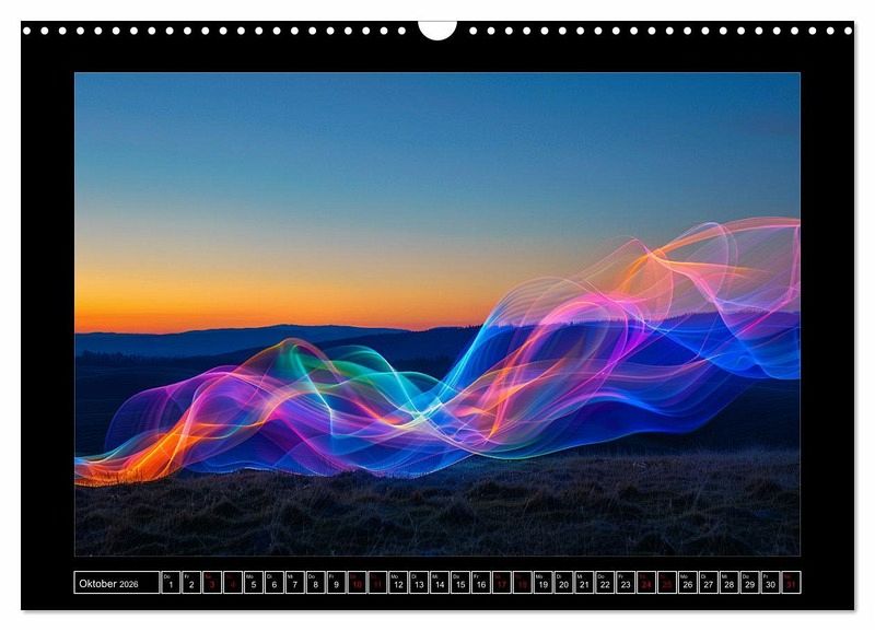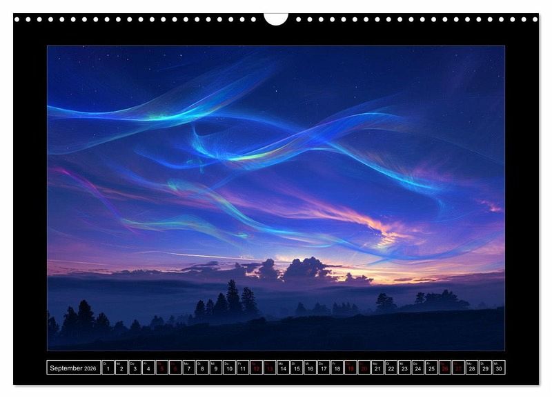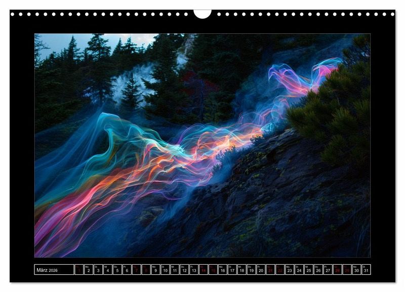 Erleben Sie die atemberaubende Schönheit der Natur auf eine völlig neue Art und Weise mit unserem einzigartigen Kalender, der von künstlicher Intelligenz (KI) gestaltete Lichtphänomene präsentiert. Die KI bekam hier verschiedene komplexe mathematische Formeln als Ausgangsinformation und interpretierte sie als Licht. Dadurch wurden die Spektralphänomene erschaffen, die die natürliche Schönheit der Dämmerung verstärken und sie in einem neuen, faszinierenden Licht erscheinen lassen.
