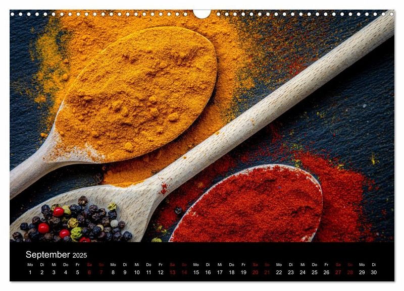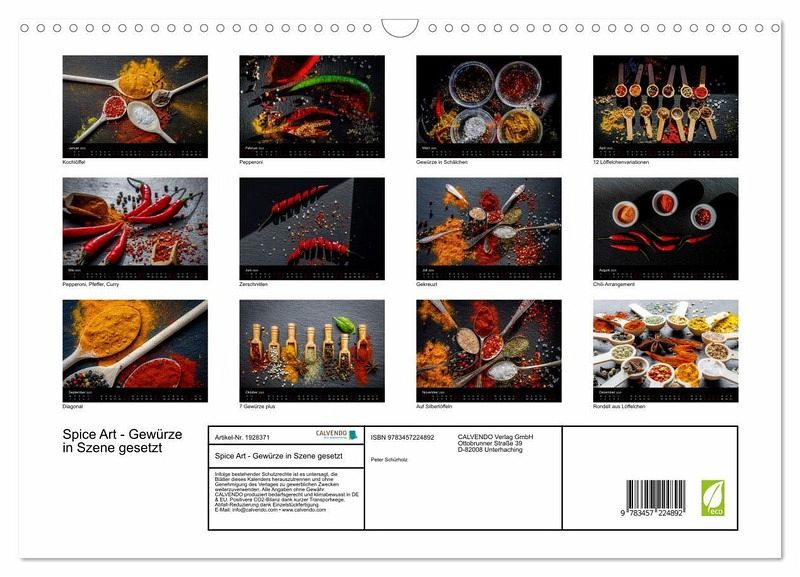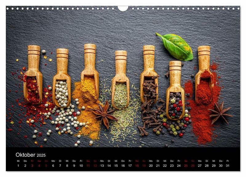 Entdecken Sie die faszinierende Welt der Gewürze in kunstvoller Darstellung! Der Kalender Spice Art zeigt die Vielfalt und Schönheit von Gewürzen auf eine ganz besondere Weise. Ob leuchtende Kurkuma, tiefroter Paprika oder feuriger Chili - jede Seite präsentiert eindrucksvolle Fotografien, die das Alltägliche in etwas Außergewöhnliches verwandeln. Lassen Sie sich Monat für Monat inspirieren und holen Sie sich die farbenfrohe Würze des Lebens in Ihr Zuhause. Ideal für Gewürzliebhaber, Kochbegeisterte und alle, die das Besondere lieben!