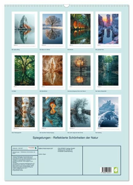 QUALITÄT - Hochwertiger Fotokalender mit 12 wunderschönen Motiven auf lichtbeständigem Bilderdruckpapier, robuste Spiralbindung mit Aufhängebügel.NACHHALTIG - deutliche Abfallreduzierung durch bedarfsgerechte Einzelstückfertigung, umweltfreundliches FSC-zertifiziertes Papier, Produktion in Deutschland, klimabewusste Logistik.PERFEKTES GESCHENK - Kalender für Freunde und Familie, für Kinder und Erwachsene, jung und alt, zu Weihnachten, Geburtstag oder zwischendurch.VIELFALT - Bildkalender in verschiedenen Formaten, z.B. DIN A5, DIN A4, DIN A3 sowie DIN A2. Ob Naturmotiv, Gemälde oder Fotos, ideal für ein persönliches Wohlfühlambiente.Fantastische Reflexionen der Natur - KI generiert von Autor(in): Catill