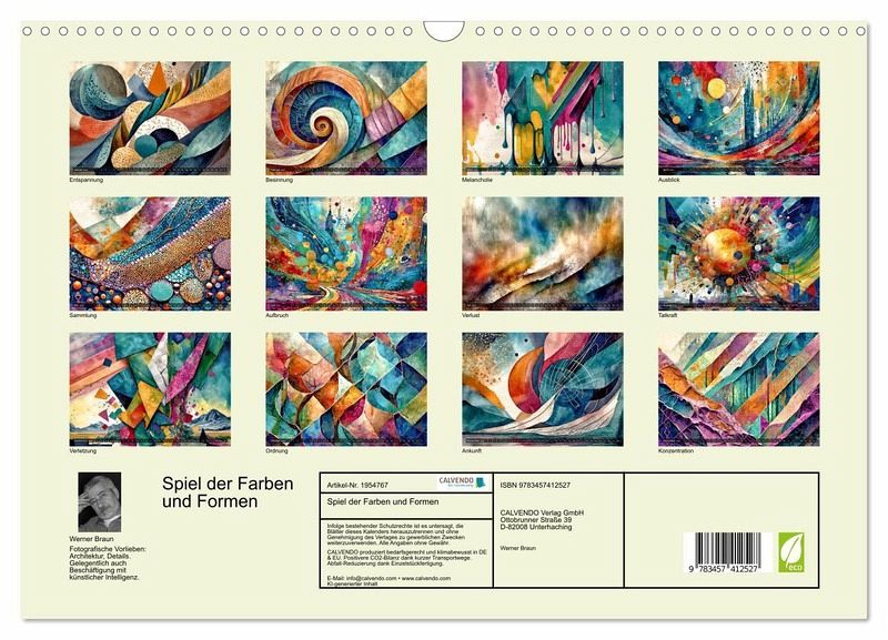 Üblicherweise lassen sich Begriffe nicht abbilden, beziehungsweise nur indirekt. Freude kann etwa "ersatzweise" durch einen freudestahlenden Menschen dargestellt werden. Eines von mehreren Zielen abstrakter Kunst war es jedoch auch, Begriffliches direkt sichtbar zu machen. Unter diesem Aspekt können die Bilder des vorliegenden Kalenders gesehen werden, welche mit Hilfe von künstlicher Intelligenz eindrucksvoll gestaltet wurden. Doch das ist nicht notwendig. Sie können den Betrachter ebenso bloß durch ihre dekorative Qualität, durch das Spiel von Farben und Formen in den Bann ziehen. Wie man sich den Bildern auch nähert: Auf jeder Wand sind sie eine Zierde.