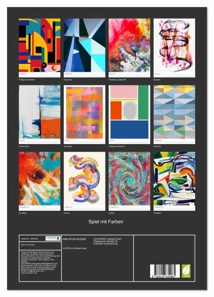 Ein einzigartiger Wandkalender für den Kunstfreund. Abstrakte Formen und Farben für 12 Monate. Motive mit viel Fantasie von Internationalen freischaffenden Künstlern geschaffen.Motive, die auch nachher als gerahmtes Bild etwas hermachen.