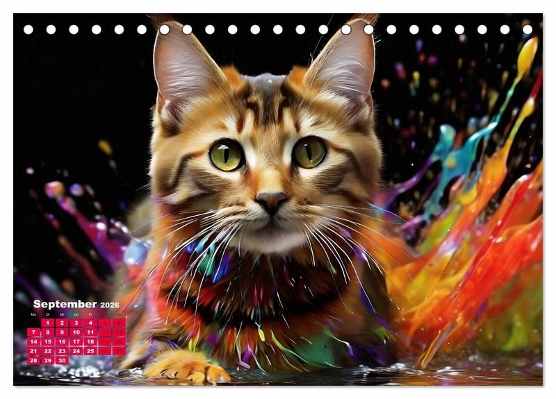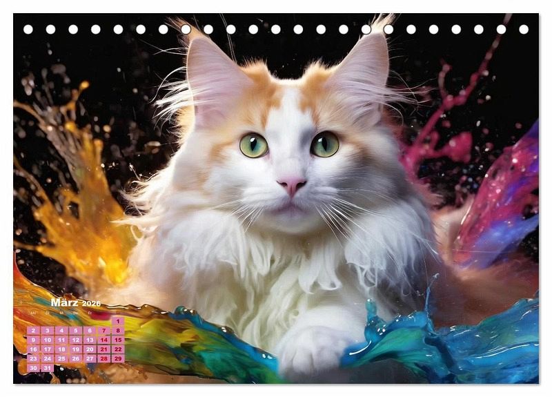Januar: Langhaar Katze schaut nach vorne im bunten Splash