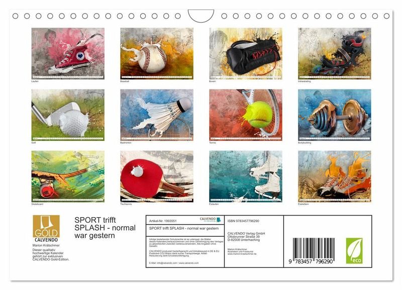 Mein Sport als Kunstwerk - eine ästhetische Komposition aus anspruchsvoller Studiofotografie, lebendigen Bleistiftzeichnungen und kreativer Malerei. Farbenfrohe dynamische Splashes machen neugierig und geben den Kunstwerken einen surrealen Touch. Dieser qualitativ hochwertige Kalender gehört zur exklusiven CALVENDO Gold-Edition und wurde zusätzlich in der Kategorie Sportfotografie ausgezeichnet.