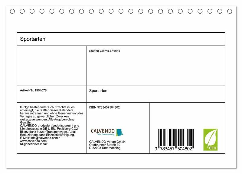 QUALITÄT - Hochwertiger Fotokalender mit 12 wunderschönen Motiven auf lichtbeständigem Bilderdruckpapier, robuste Spiralbindung.NACHHALTIG - deutliche Abfallreduzierung durch bedarfsgerechte Einzelstückfertigung, umweltfreundliches FSC-zertifiziertes Papier, Produktion in Deutschland, klimabewusste Logistik.PERFEKTES GESCHENK - Kalender für Freunde und Familie, für Kinder und Erwachsene, jung und alt, zu Weihnachten, Geburtstag oder zwischendurch.VIELFALT - Bildkalender in verschiedenen Formaten, z.B. DIN A5, DIN A4, DIN A3 sowie DIN A2. Ob Naturmotiv, Gemälde oder Fotos, ideal für ein persönliches Wohlfühlambiente.Sportarten sind verschiedene körperliche Aktivitäten, die von Einzelpersonen oder Teams ausgeübt werden, um körperliche Fitness, Wettkampffähigkeiten oder einfach nur zur Freizeitgestaltung zu verbessern. von Autor(in): Steffen Gierok ; Magik Artist Design