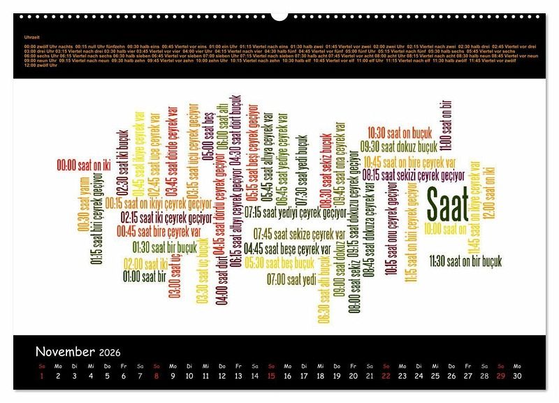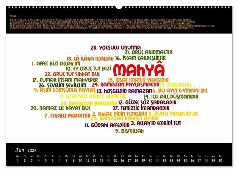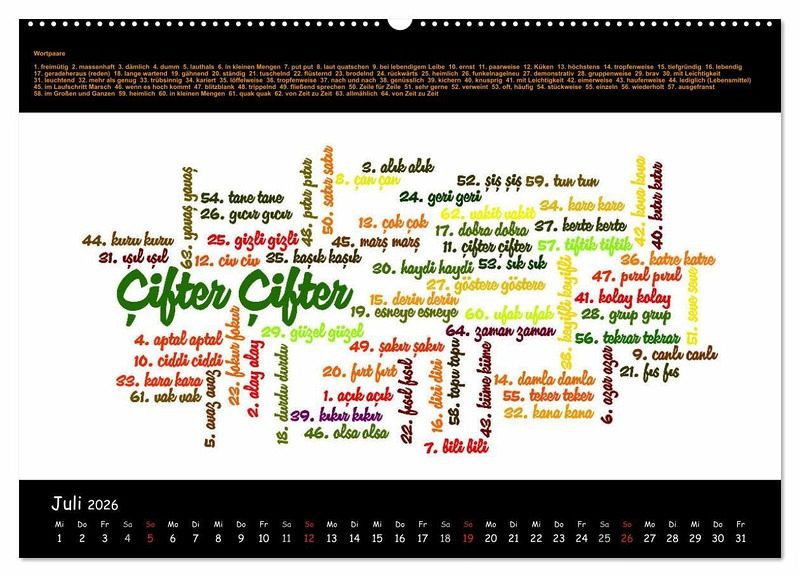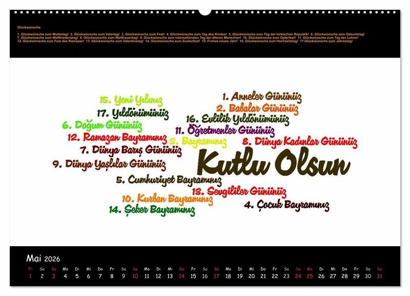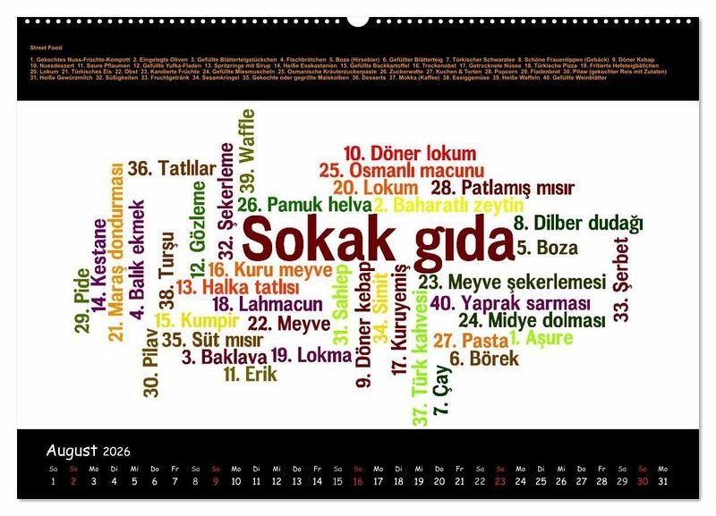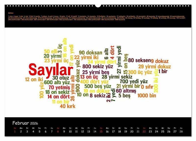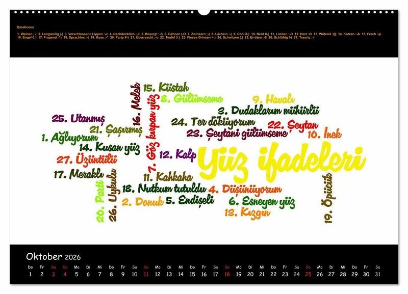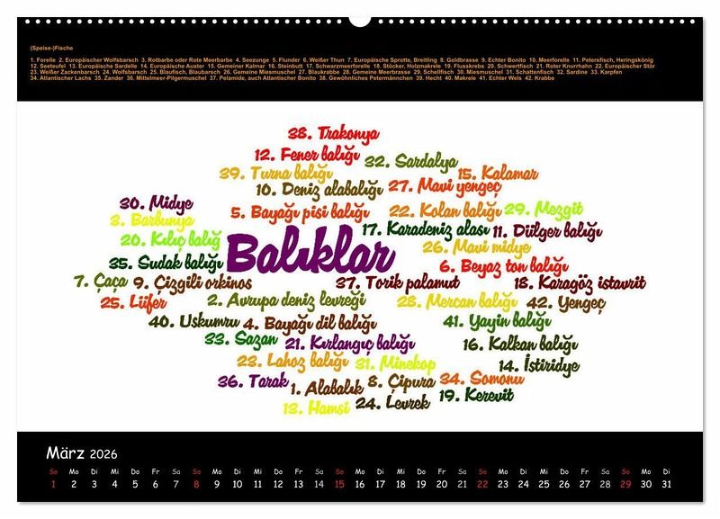 Mit diesem Kalender werden Ihnen 12 ausführliche thematische Wortschätze in Form von Wordclouds vorgestellt, um Ihre Türkisch- und Deutschkenntnisse zu vertiefen: Staaten Europas - Zahlen - Speisefische - Zeitlose Handwerkskünste - Glückwünsche - Religiöse Lichterketten - Wortpaare - Streetfood - Sprichwörter - Emoticons - Uhrzeit - Gott
