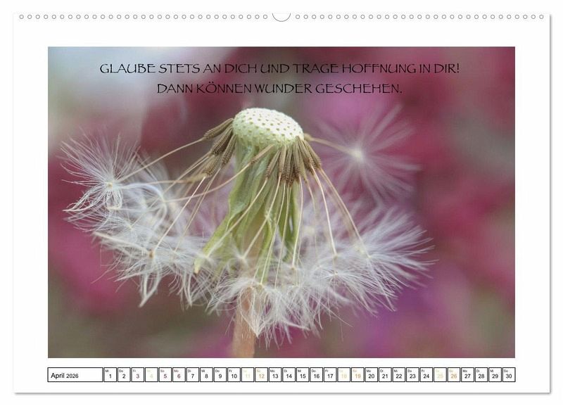 Oftmals fühlen wir uns traurig oder hoffnungslos, manchmal alleine oder überfordert. Mit diesem Spruch Kalender möchte ich euch Hoffnung geben, Euch ein Lächeln ins Gesicht zaubern. Impulse anregen, zum Nachdenken bringen. Mit liebevoll ausgewählten Momenten von Natur und Tier im Bild festgehalten wird dieser, mit viel Liebe gestaltete Kalender abgerundet.