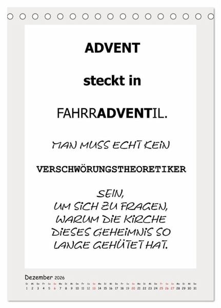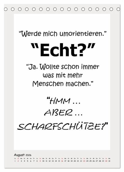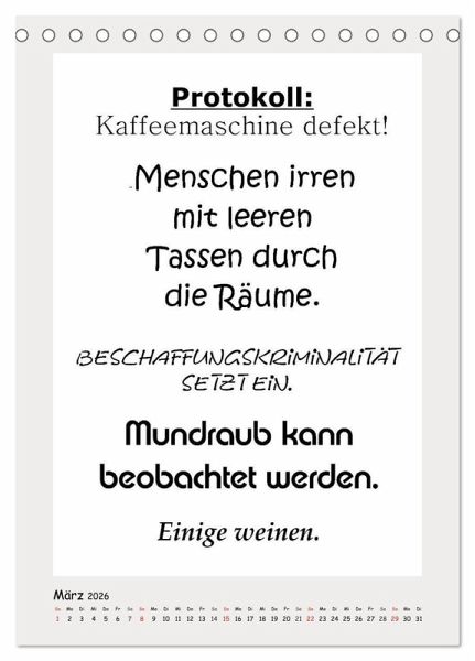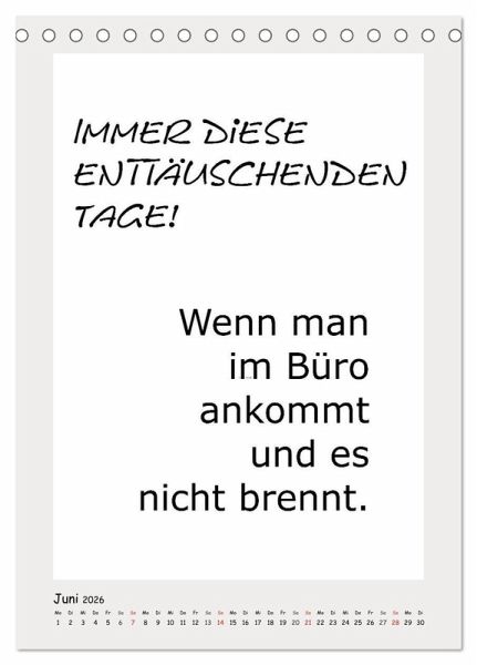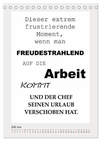 Dieser witzige Typo-Kalender bringt Schwung an leere Bürowände. Fiese und lustige Sprüche bringen gute Laune und zaubern ein Schmunzeln auf Kollegen-Gesichter. Absichtlich schlicht gehalten, bietet dieser Kalender auch genügend Platz für Notizen und er eignet sich natürlich als humorvolles Geschenk.