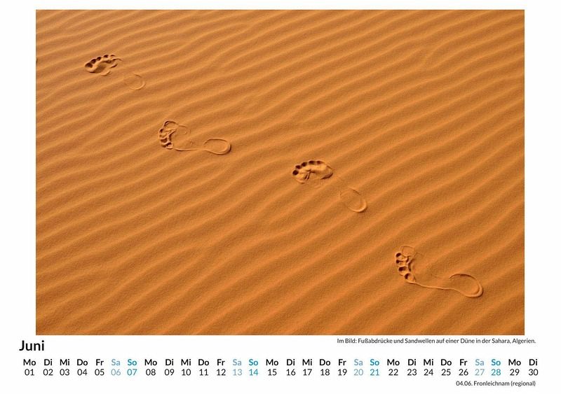 Entdecken Sie die Schönheit der Natur mit unserem Wandkalender "Spuren im Sand". Lassen Sie sich Monat für Monat von 12 atemberaubenden Motiven verzaubern, die die vergänglichen, aber faszinierenden Spuren im Sand einfangen. Gedruckt auf hochwertigem, lichtbeständigem Bilderdruckpapier, bringt dieser Kalender die Ruhe und Harmonie der Natur direkt in Ihr Zuhause. Nachhaltigkeit liegt uns am Herzen: Der Kalender wird in Deutschland auf FSC-zertifiziertem Papier produziert. Perfekt als Geschenk oder für die eigene Wand - holen Sie sich ein Stück Natur in Ihre vier Wände und genießen Sie jeden Tag einen neuen Blick auf die Schönheit der Welt! Hochwertig Erleben Sie ein Jahr voller Eleganz mit unserem Premium-Fotokalender. Jedes der 12 Motive ist auf hochwertigem, lichtbeständigem Bilderdruckpapier gedruckt, um die Lebendigkeit jedes Bildes zu bewahren. Die robuste Spiralbindung gewährleistet Langlebigkeit und einfache Handhabung. Nachhaltig Unser Engagement für die Umwelt spiegelt sich in jedem Exemplar wider. Durch die Produktion auf Abruf reduzieren wir signifikant unseren Abfall. Wir verwenden ausschließlich umweltfreundliches, FSC-zertifiziertes Papier. Stolz gefertigt in Deutschland, achten wir bei unserer Logistik auf Klimaschutz, um unseren ökologischen Fußabdruck zu minimieren. Das ideale Geschenk Dieser Kalender ist das perfekte Präsent für jeden Anlass - ob Weihnachten, Geburtstage oder einfach als liebevolle Aufmerksamkeit zwischendurch. Geeignet für Freunde, Familie, Kinder und Erwachsene gleichermaßen, bereichert er jedes Zuhause mit seiner Vielfalt und Schönheit, unabhängig vom Alter der Beschenkten.