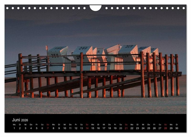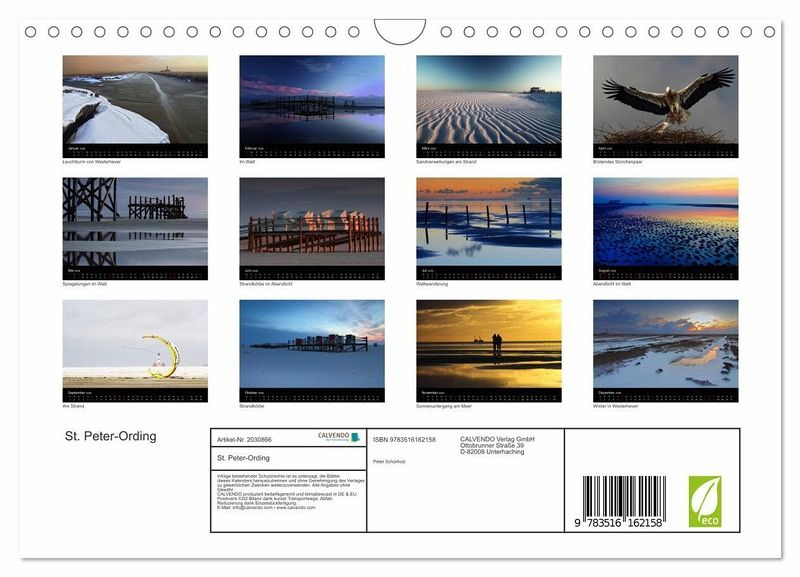 St. Peter-Ording mit seinen typischen Pfahlbauten, den endlos langen Stränden sowie dem Naturpark Wattenmeer erfreut sich großer Beliebtheit bei Urlaubern, Auch der nahe gelegene Leuchtturm von Westerhever zieht Jahr für Jahr viele Menschen an. Die Aufnahmen dieses Kalenders entstanden bei diversen Aufenthalten zu unterschiedlichen Jahreszeiten.