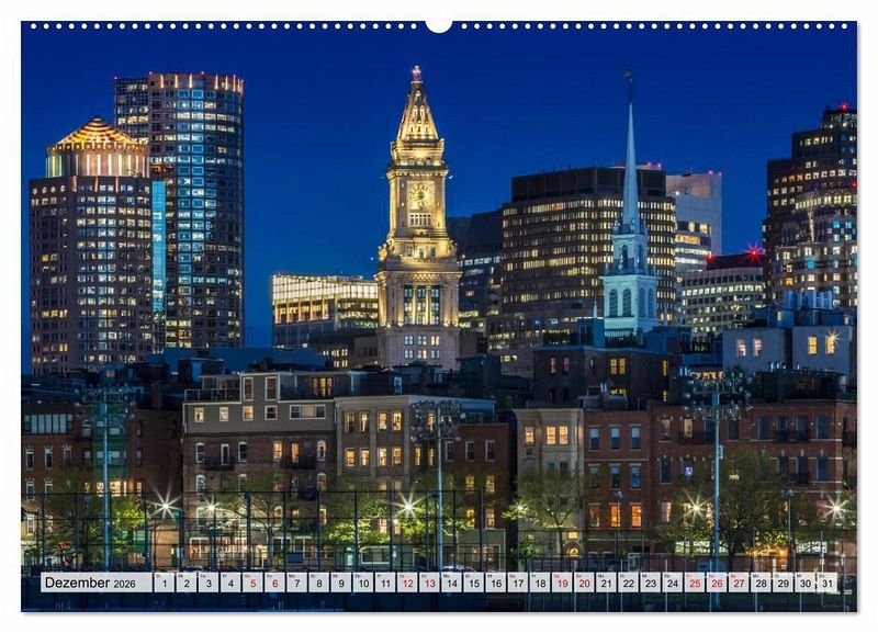 Boston ist eine der ältesten Städte in den USA und bekannt als Wiege der amerikanischen Demokratie. Erkunden Sie die Metropole in diesem Kalender bei Tag und Nacht, um die Geschichte sowie Moderne in allen Silhouetten zu erleben. Ob auf dem Freedom Trail, der an Schauplätzen historischer Ereignisse entlangführt oder auf vielen anderen Wegen, Boston ist eine abwechslungsreiche und harmonische Stadt.