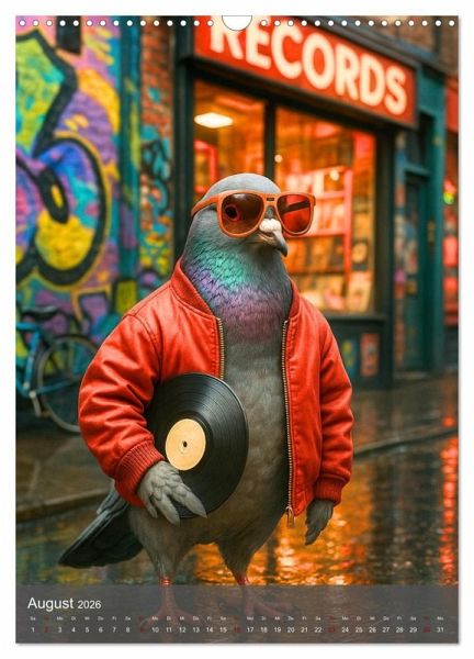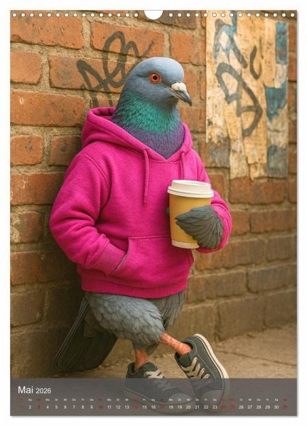 Zwölf Motive, szenisch überhöht und mit feinem Humor, zeigen, dass Tauben mehr sind als ihr Ruf: urban, cool und ziemlich unterschätzt. Der Kalender ist mit Unterstützung von KI entstanden.