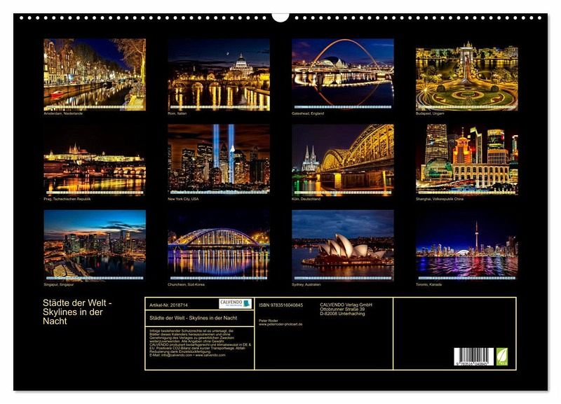 Faszinierende Ansichten moderner Großstädte in der Nacht, pulsierendes Leben aber auch Orte der Stille. Für diesen Kalender hat der Fotokünstler Peter Roder zwölf wunderschöne Aufnahmen zusammengestellt und gestaltet, ein zauberhafter Hingucker für das ganze Jahr.