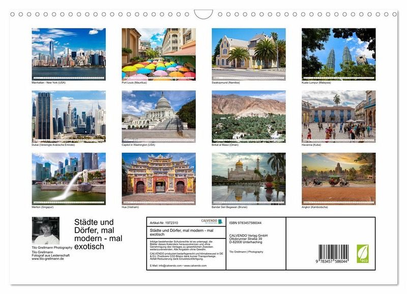 QUALITÄT - Hochwertiger Fotokalender mit 12 wunderschönen Motiven auf lichtbeständigem Bilderdruckpapier, robuste Spiralbindung mit Aufhängebügel.NACHHALTIG - deutliche Abfallreduzierung durch bedarfsgerechte Einzelstückfertigung, umweltfreundliches FSC-zertifiziertes Papier, Produktion in Deutschland, klimabewusste Logistik.PERFEKTES GESCHENK - Kalender für Freunde und Familie, für Kinder und Erwachsene, jung und alt, zu Weihnachten, Geburtstag oder zwischendurch.VIELFALT - Bildkalender in verschiedenen Formaten, z.B. DIN A5, DIN A4, DIN A3 sowie DIN A2. Ob Naturmotiv, Gemälde oder Fotos, ideal für ein persönliches Wohlfühlambiente.Moderne Städte und exotische Dörfer in fernen Ländern aus einem anderen Blickwinkel von Autor(in): Tilo Grellmann