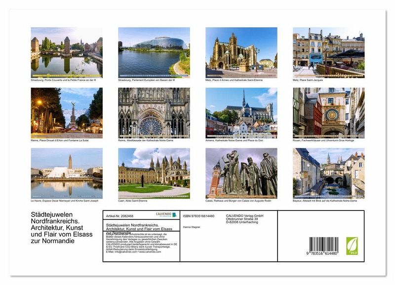 Ob gotische Kathedrale, Jugendstilfassade oder moderner Hafenblick - dieser Kalender vereint die schönsten Seiten nordfranzösischer Städte zu einem visuellen Erlebnis voller Eleganz und Atmosphäre. Zwischen dem historischen Strasbourg, dem geschichtsträchtigen Reims, dem maritimen Le Havre und dem charmanten Bayeux offenbart sich Frankreichs kulturelle Vielfalt auf besonders eindrucksvolle Weise. Für Liebhaber architektonischer Pracht, französischer Lebensart und stiller Reiseschönheiten - Monat für Monat ein städtischer Augenschmaus.