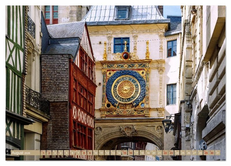 August: Rouen, Fachwerkhäuser und Uhrenturm Gros-Horloge