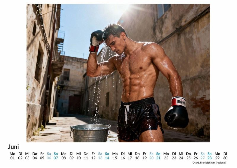 Der Gong ertönt, Schweißperlen bilden sich auf der Haut, jeder Muskel ist angespannt. Der Kalender "Starke Boxer" fängt die rohe Energie und die konzentrierte Kraft des Boxsports in zwölf eindrucksvollen Momentaufnahmen ein. Dieser Kalender ist eine ausgezeichnete Wahl: Für Liebhaber ästhetischer Sportdarstellungen. Für alle, die von der Disziplin und Kraft des Boxens fasziniert sind. Für jene, die einen Kalender mit markanten und kraftvollen Motiven suchen. Jeder Monat präsentiert einen Athleten in einem Augenblick der Anspannung oder Erschöpfung nach dem Kampf. Der Fokus liegt auf der Ästhetik des durchtrainierten Körpers, von definierten Bauchmuskeln bis zum Schweiß, der vom Kinn tropft. Die Athleten tragen nur Boxershorts und Handschuhe. Diese zwölf einzigartigen Porträts wurden durch die Kraft von Rechenalgorithmen erschaffen und fangen eine idealisierte Vision von Stärke ein. Die Bilder zeigen die Essenz des Kampfes in scharfen Details. Was der Kalender bietet: Ein Wandkalender mit 12 Monatsblättern und einem Deckblatt. Großformatige Aufnahmen von athletischen Boxern. Ein praktisches Kalendarium für die Organisation von Terminen. Der Kalender "Starke Boxer" ist eine Hommage an die körperliche Ästhetik und den unbändigen Willen, der den Boxsport ausmacht. Eine Sammlung von Motiven, die das ganze Jahr über an Disziplin und Kraft erinnert. Es lohnt sich, die zwölf Motive zu betrachten und sich von der Energie anstecken zu lassen.