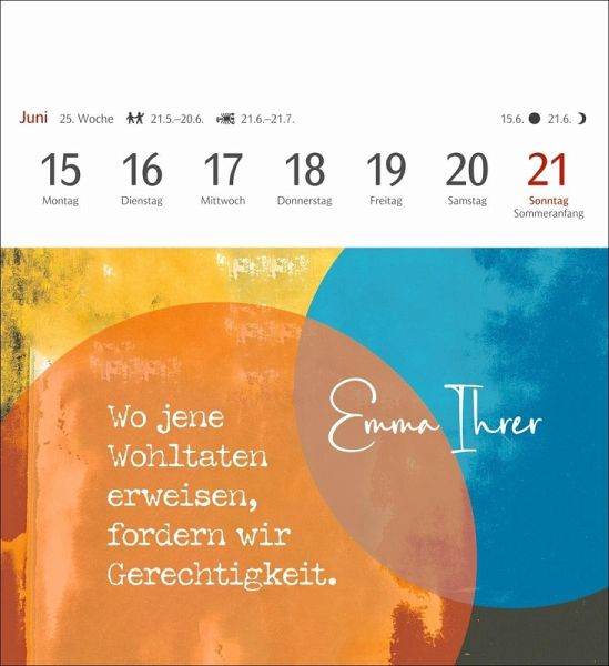 - Lassen Sie sich von berühmten Frauen der Welt-und Zeitgeschichte inspirieren: Postkartenkalender 2026- Zitate von Frauen, die bewegen und zum Nachdenken anregen: Wochen-Tischkalender zum Aufstellen oder Aufhängen- Der richtige Begleiter auf dem Weg zur Gleichberechtigung: Kalender mit Zitaten bekannter Frauenrechtlerinnen- Großes Empowerment im kleinen Format: Tischkalender im Format 16 x 17,5 cm mit 53 heraustrennbaren Postkarten zum Versenden oder Selbstbehalten- Nützliches Wissen in schöner Verpackung: Die Kalender von Harenberg aus dem Athesia Kalenderverlag
