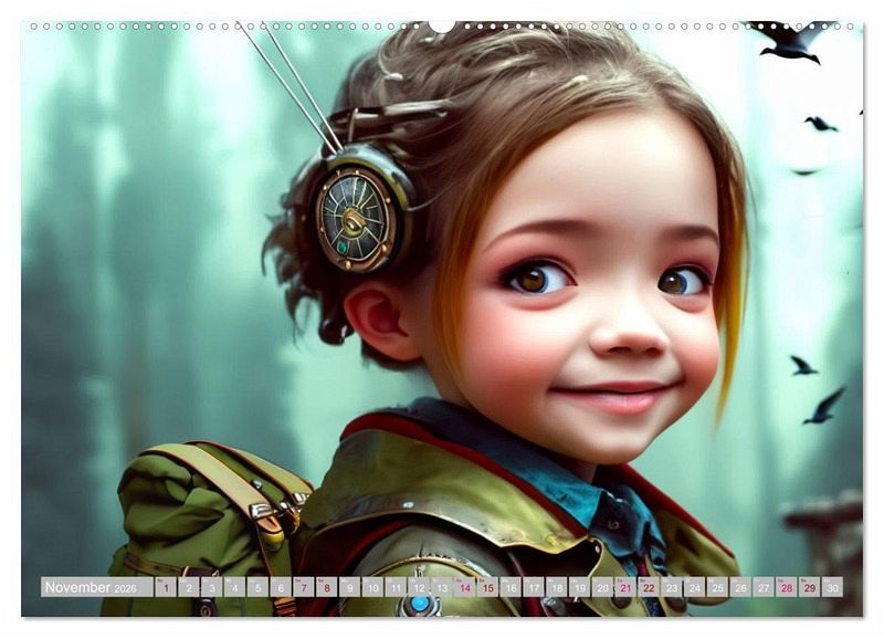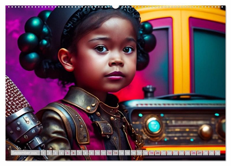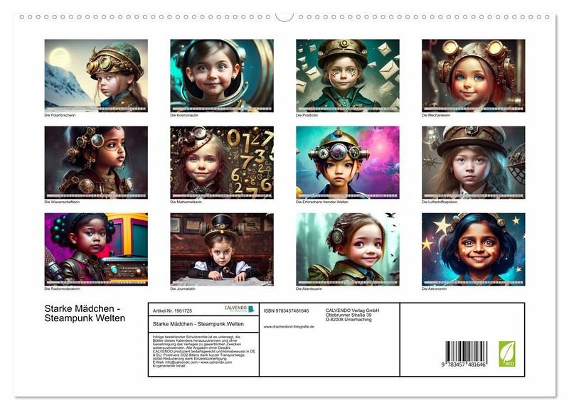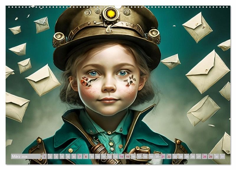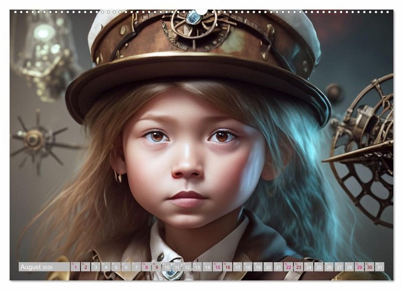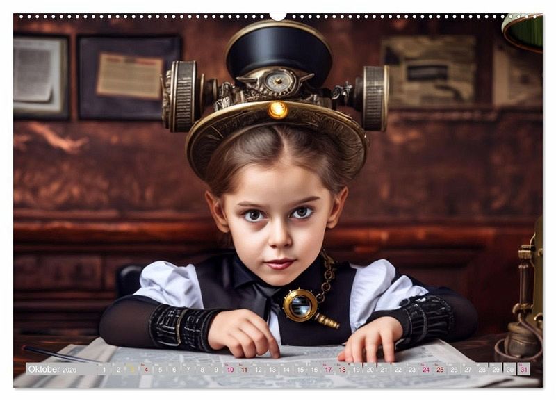 Steampunk ist ein Kunst- und Lebensstil, der Elemente der Vergangenheit mit Aspekten der Zukunft verbindet. Mädchen können sich fantasievoll in diese Welt hineinversetzen und ihre eigenen Rollen kreieren. Sie können beispielsweise als Erfinderinnen, Mechanikerinnen oder Luftschiffkapitäninnen agieren. Rollenspiele sind eine großartige Möglichkeit für Mädchen, ihre Kreativität auszudrücken und ihre Fantasie zu nutzen, wie z.B. beim Bauen von Dampfmaschinen oder beim Entwerfen von Steampunk-Kostümen. Der Kalender wurde mit Ki und Photoshop erstellt.