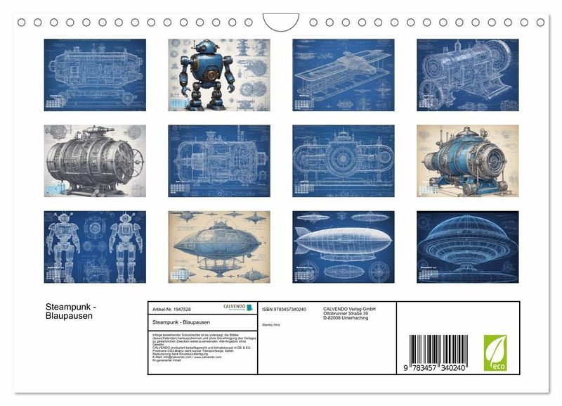 Erleben Sie die Meisterwerke der Steampunk-Ingenieurskunst in jeder einzelnen Blaupause: Von majestätischen Luftschiffen über raffinierte Roboter bis hin zu imposanten Maschinen - dieser Kalender entführt Sie in eine Ära der mechanischen Wunder.