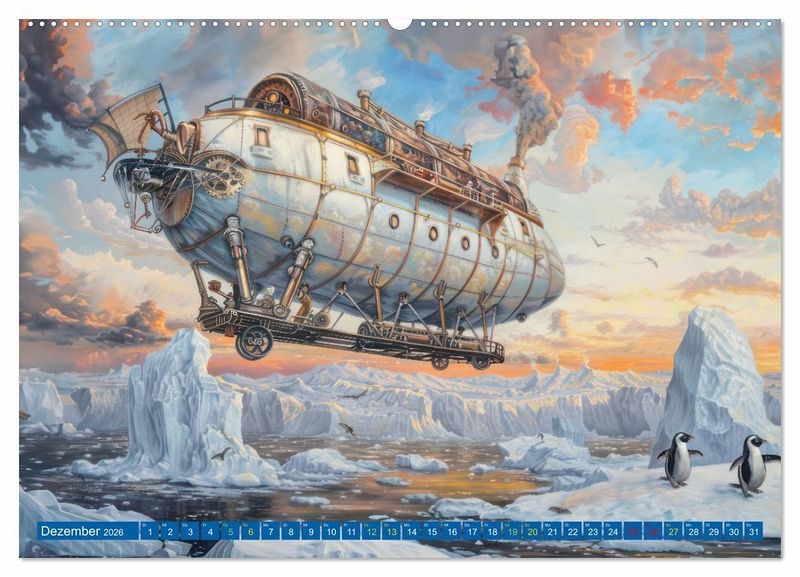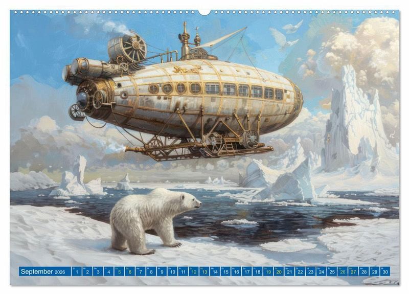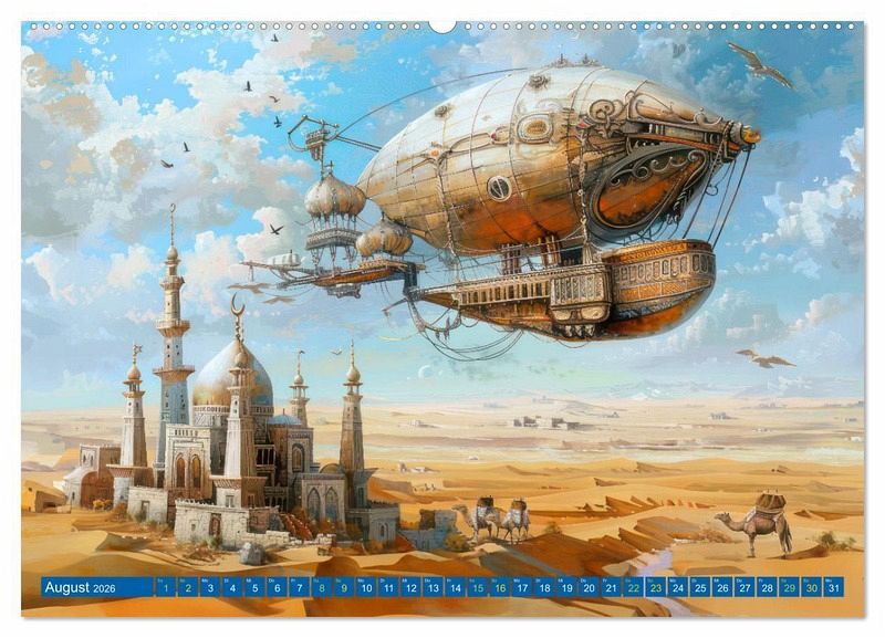 Von exotischen Wüstenlandschaften bis hin zu eisigen Polarregionen, die mit Hilfe der KI erstellten Luftschiffe nehmen Sie mit auf eine abenteuerliche Reise. Jeder Monat präsentiert Ihnen eine neue, atemberaubende surreale Szenerie.