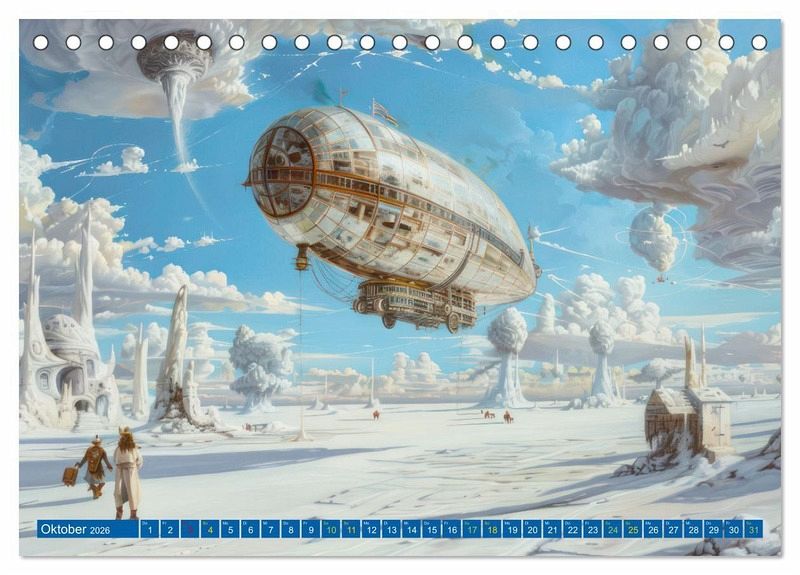 Von exotischen Wüstenlandschaften bis hin zu eisigen Polarregionen, die mit Hilfe der KI erstellten Luftschiffe nehmen Sie mit auf eine abenteuerliche Reise. Jeder Monat präsentiert Ihnen eine neue, atemberaubende surreale Szenerie.