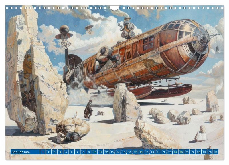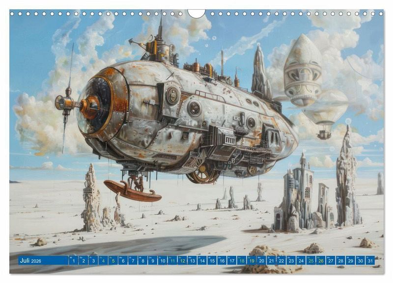 Von exotischen Wüstenlandschaften bis hin zu eisigen Polarregionen, die mit Hilfe der KI erstellten Luftschiffe nehmen Sie mit auf eine abenteuerliche Reise. Jeder Monat präsentiert Ihnen eine neue, atemberaubende surreale Szenerie.