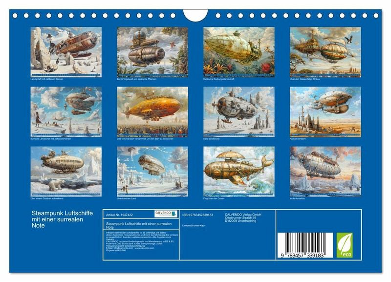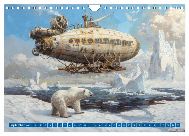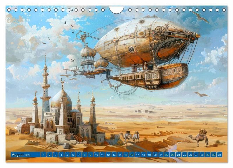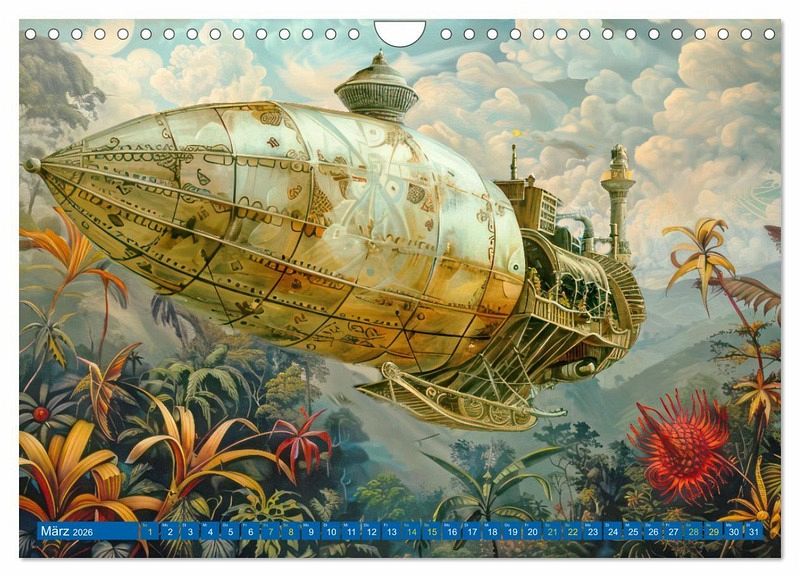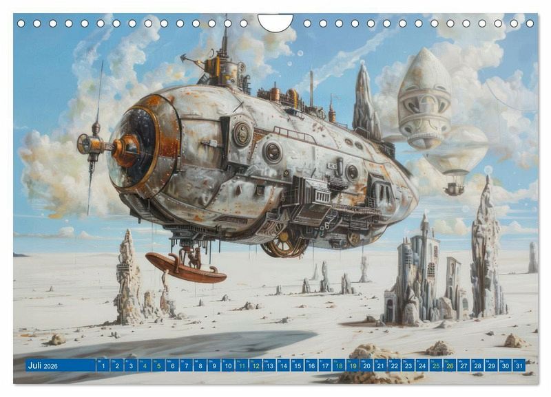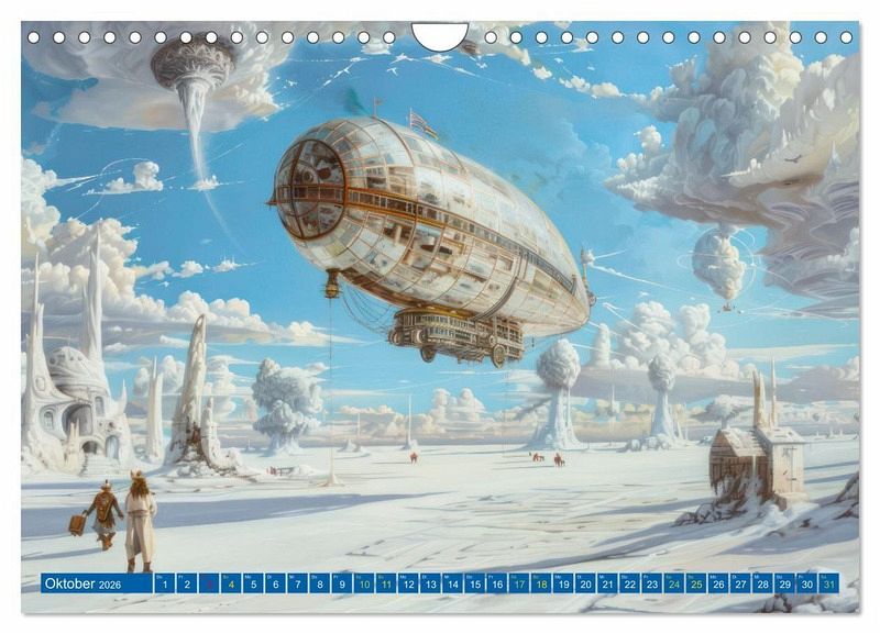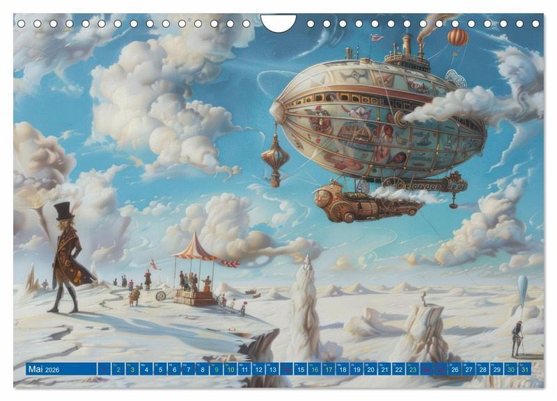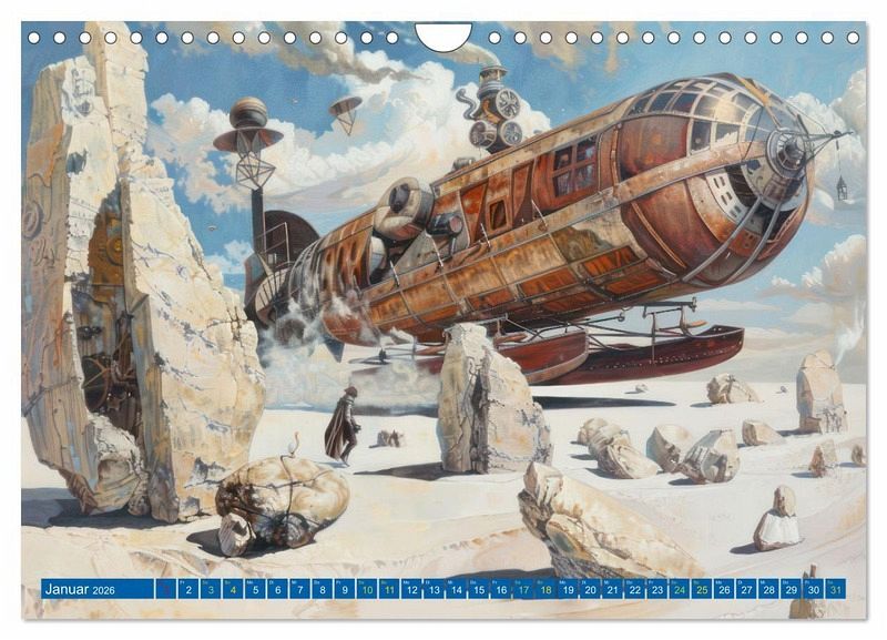 Tauchen Sie ein in die faszinierende Welt der Steampunk Luftschiffe. Lassen Sie sich von den kreativen und fantasievollen Darstellungen dieser außergewöhnlichen Fluggeräte verzaubern, während sie die unterschiedlichsten Landschaften überqueren. Von exotischen Wüstenlandschaften bis hin zu eisigen Polarregionen, die mit Hilfe der KI erstellten Luftschiffe nehmen Sie mit auf eine abenteuerliche Reise. Jeder Monat präsentiert Ihnen eine neue, atemberaubende surreale Szenerie. Die Magie der Steampunk Welt verzaubert einfach. Ein Muss für alle Fans von Fantasy und Kreativität.
