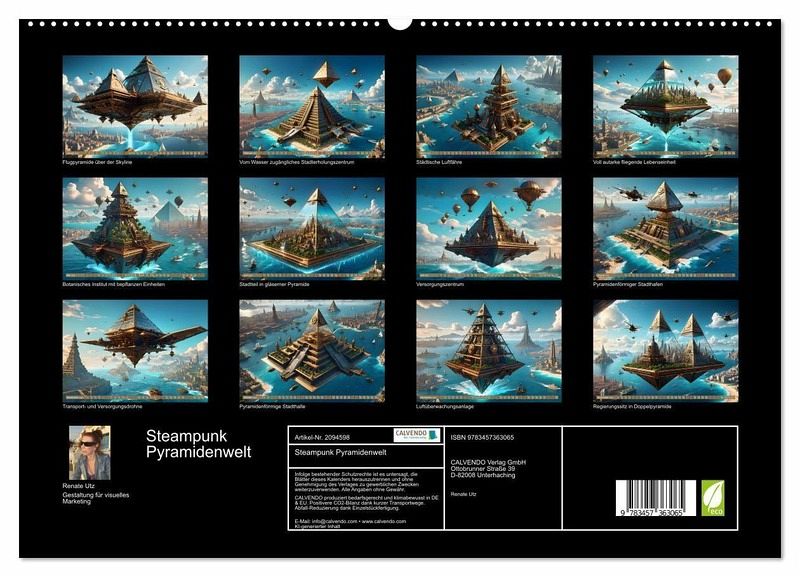 Retro-futuristische Bilder entführen uns in die surreale Steampunk-Welt mit monumentalen architektonischen Bauwerken und atemberaubenden Flugpyramiden, mit einer Technologie jenseits unserer Vorstellungskraft. Begib dich auf eine inspirierende Reise in fiktive Welten und erkunde jeden Monat andere mechanische Wunderwerke der Technik und Architektur, entstanden aus der Fantasie. Entdecke neue, fantastische Möglichkeiten zur Erschaffung neuer Lebensräume und bestaune großräumige Fortbewegungsmittel. Der mithilfe von KI kreierte Kalender von Renate Utz ist ein außergewöhnliches Geschenk, das nicht nur eingefleischten Steampunk-Fans große Freude bereiten wird.