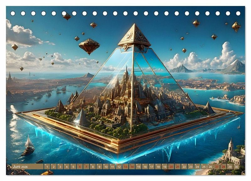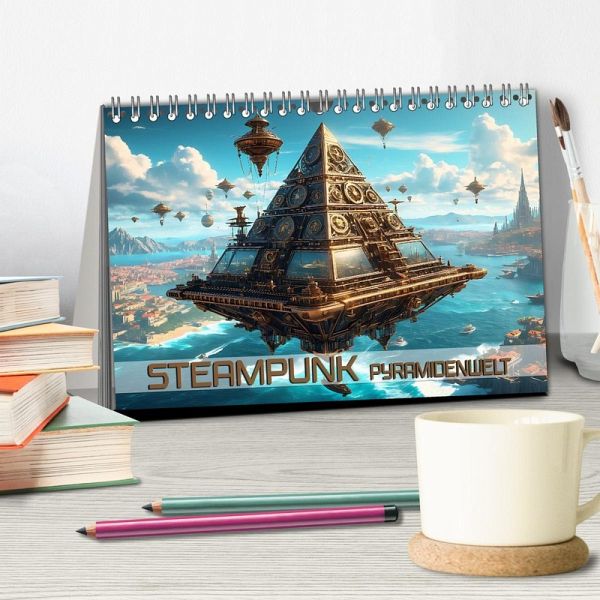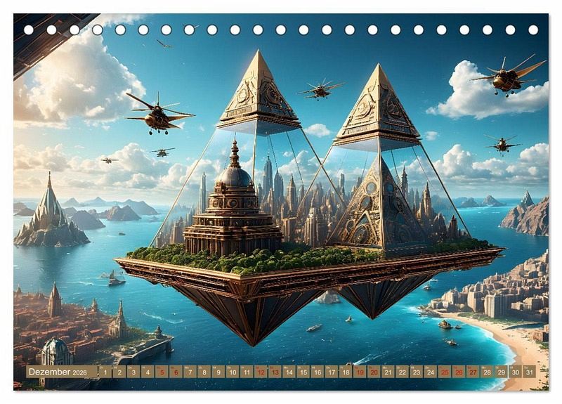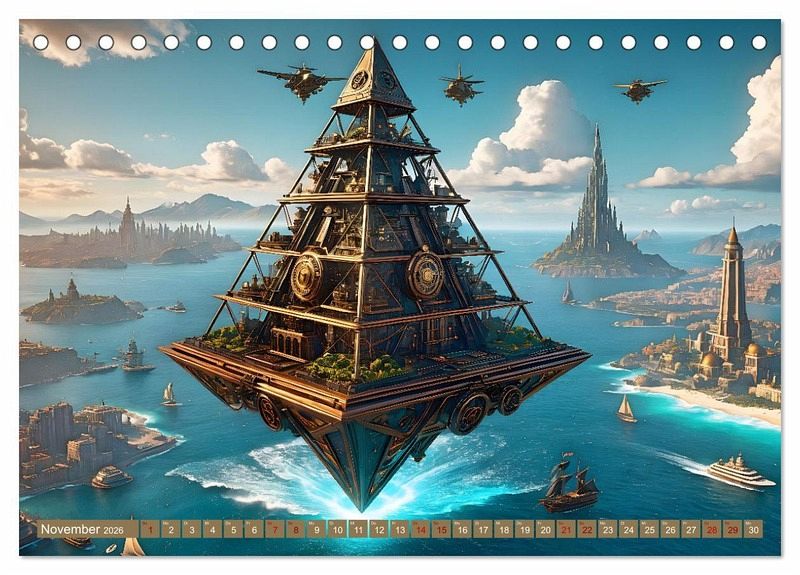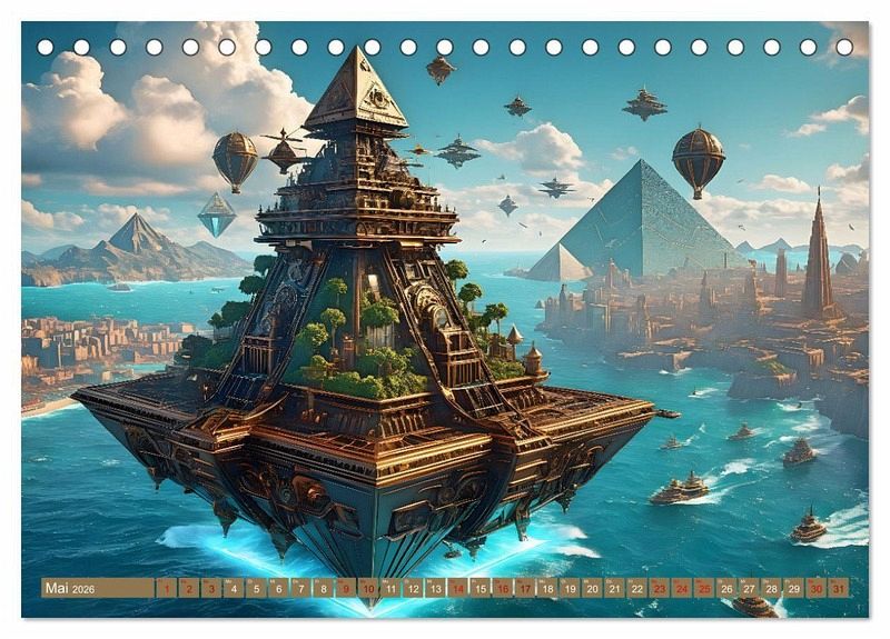 Retro-futuristische Bilder entführen uns in die surreale Steampunk-Welt mit monumentalen architektonischen Bauwerken und atemberaubenden Flugpyramiden, mit einer Technologie jenseits unserer Vorstellungskraft. Begib dich auf eine inspirierende Reise in fiktive Welten und erkunde jeden Monat andere mechanische Wunderwerke der Technik und Architektur, entstanden aus der Fantasie. Entdecke neue, fantastische Möglichkeiten zur Erschaffung neuer Lebensräume und bestaune großräumige Fortbewegungsmittel. Der mithilfe von KI kreierte Kalender von Renate Utz ist ein außergewöhnliches Geschenk, das nicht nur eingefleischten Steampunk-Fans große Freude bereiten wird.