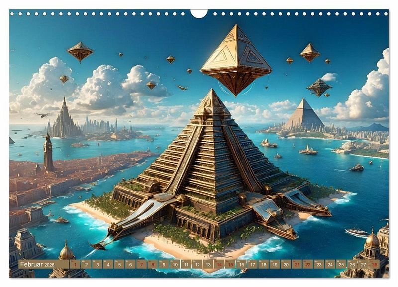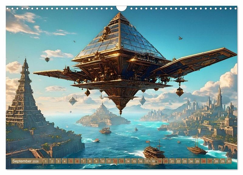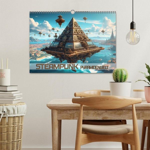 Retro-futuristische Bilder entführen uns in die surreale Steampunk-Welt mit monumentalen architektonischen Bauwerken und atemberaubenden Flugpyramiden, mit einer Technologie jenseits unserer Vorstellungskraft. Begib dich auf eine inspirierende Reise in fiktive Welten und erkunde jeden Monat andere mechanische Wunderwerke der Technik und Architektur, entstanden aus der Fantasie. Entdecke neue, fantastische Möglichkeiten zur Erschaffung neuer Lebensräume und bestaune großräumige Fortbewegungsmittel. Der mithilfe von KI kreierte Kalender von Renate Utz ist ein außergewöhnliches Geschenk, das nicht nur eingefleischten Steampunk-Fans große Freude bereiten wird.