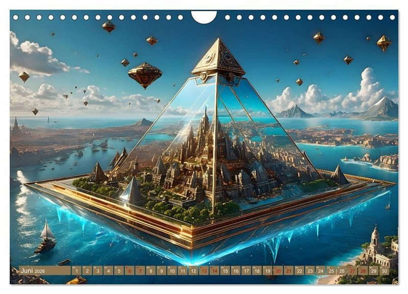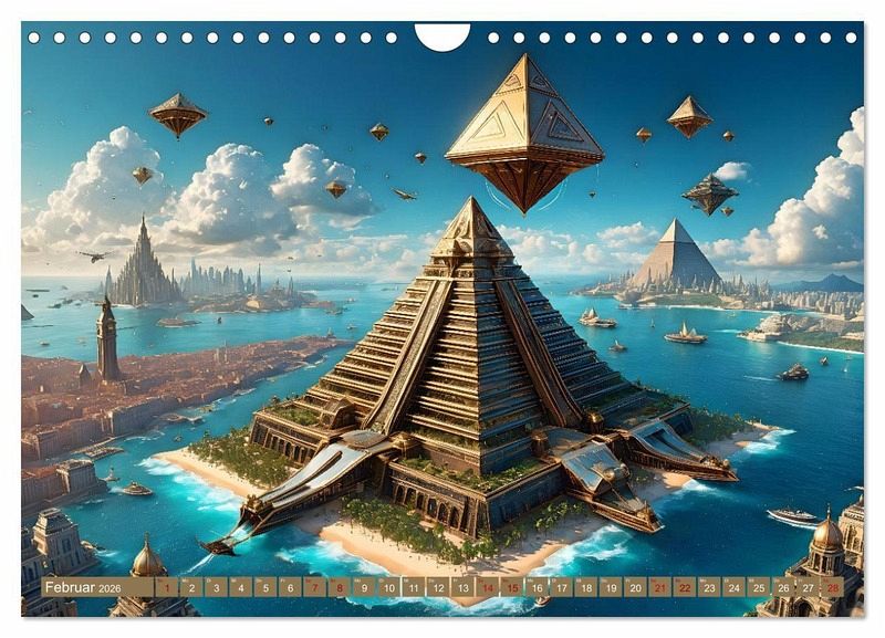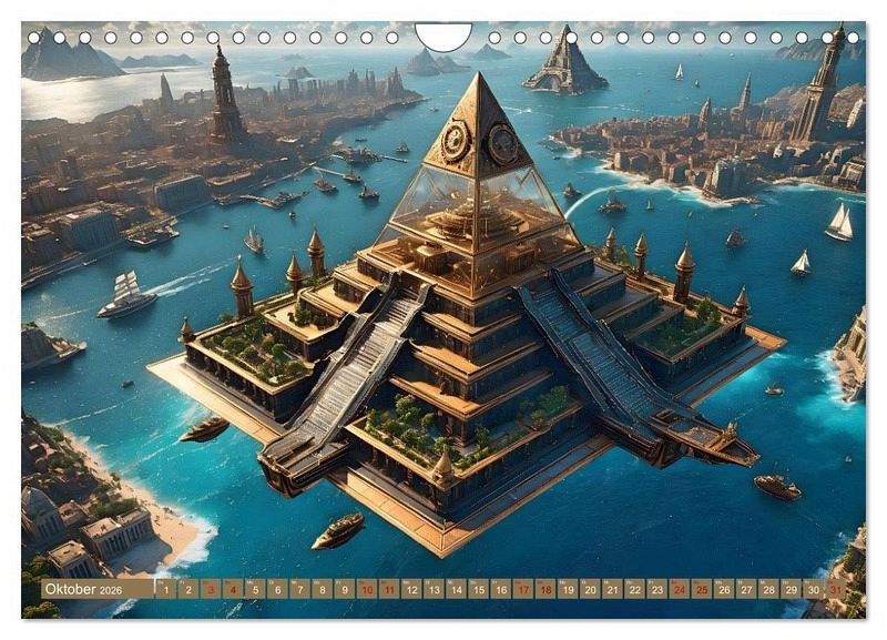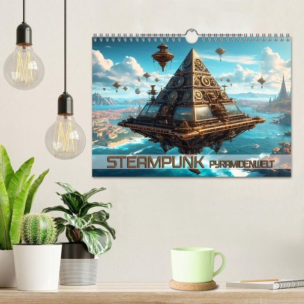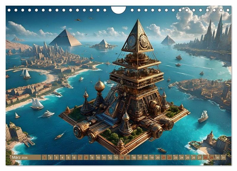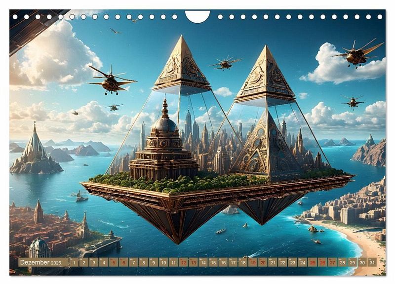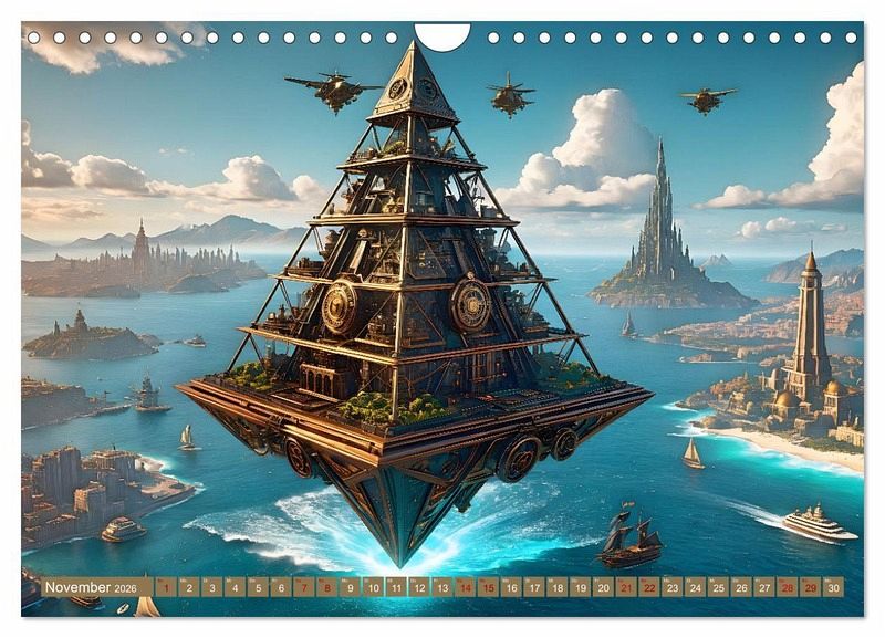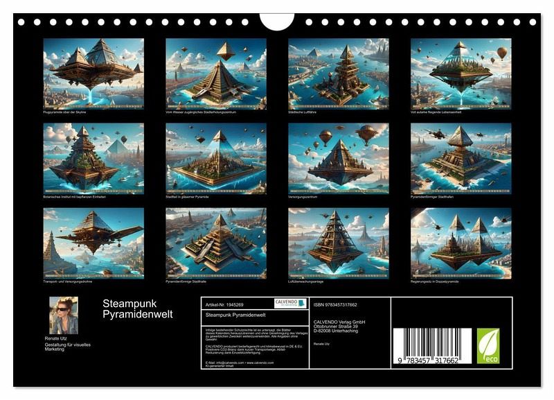 Retro-futuristische Bilder entführen uns in die surreale Steampunk-Welt mit monumentalen architektonischen Bauwerken und atemberaubenden Flugpyramiden, mit einer Technologie jenseits unserer Vorstellungskraft. Begib dich auf eine inspirierende Reise in fiktive Welten und erkunde jeden Monat andere mechanische Wunderwerke der Technik und Architektur, entstanden aus der Fantasie. Entdecke neue, fantastische Möglichkeiten zur Erschaffung neuer Lebensräume und bestaune großräumige Fortbewegungsmittel. Der mithilfe von KI kreierte Kalender von Renate Utz ist ein außergewöhnliches Geschenk, das nicht nur eingefleischten Steampunk-Fans große Freude bereiten wird.