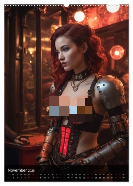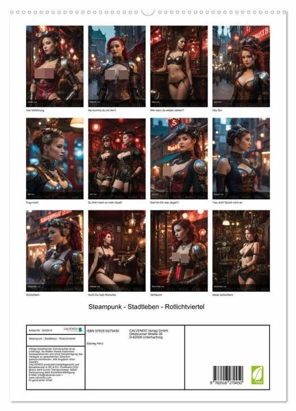 Tauchen Sie ein in das geheimnisvolle Rotlichtviertel der Steampunk-Ära! Unser einzigartiger Kalender enthüllt eine Welt, in der sinnliche Schönheiten im Steampunk-Stil die Straßen durchstreifen. Jeder Monat präsentiert kunstvolle Illustrationen leicht bekleideter Damen, deren Eleganz und Anmut von dampfbetriebenen Maschinen und viktorianischer Raffinesse umgeben sind. Diese Kombination aus Nostalgie und futuristischem Flair wird Ihre Fantasie beflügeln und Sie in eine Welt der Phantasie entführen. Lassen Sie sich von den detailreichen Szenen verzaubern, die das Rotlichtviertel in einem ganz neuen Licht erscheinen lassen. Erleben Sie die künstlerische Interpretation eines vergangenen Zeitalters, in dem Sinnlichkeit und Technologie auf faszinierende Weise verschmelzen.