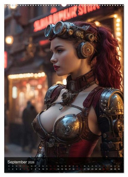 Tauchen Sie ein in das geheimnisvolle Rotlichtviertel der Steampunk-Ära! Unser einzigartiger Kalender enthüllt eine Welt, in der sinnliche Schönheiten im Steampunk-Stil die Straßen durchstreifen. Jeder Monat präsentiert kunstvolle Illustrationen leicht bekleideter Damen, deren Eleganz und Anmut von dampfbetriebenen Maschinen und viktorianischer Raffinesse umgeben sind. Diese Kombination aus Nostalgie und futuristischem Flair wird Ihre Fantasie beflügeln und Sie in eine Welt der Phantasie entführen. Lassen Sie sich von den detailreichen Szenen verzaubern, die das Rotlichtviertel in einem ganz neuen Licht erscheinen lassen. Erleben Sie die künstlerische Interpretation eines vergangenen Zeitalters, in dem Sinnlichkeit und Technologie auf faszinierende Weise verschmelzen.