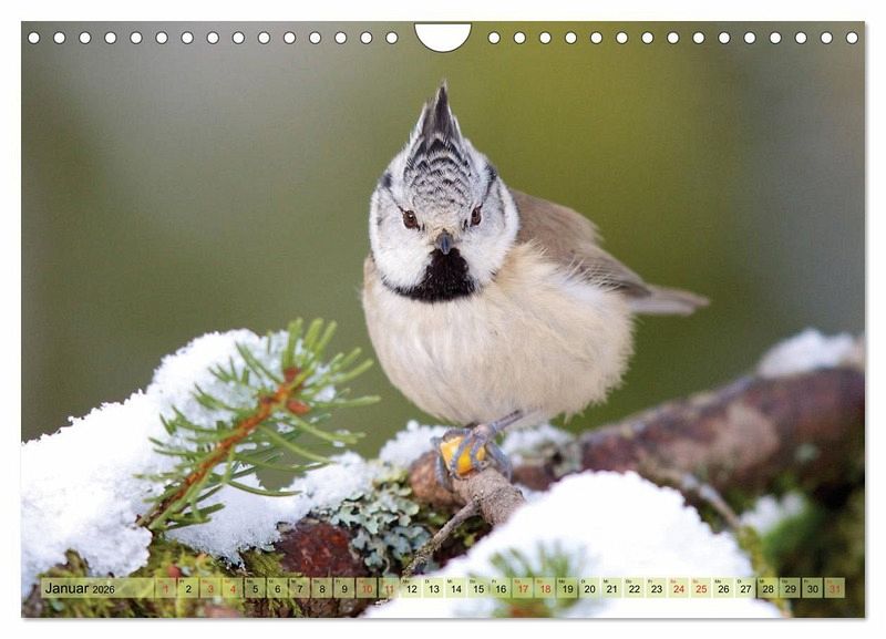 Abbildungen: Januar: Haubenmeise Februar: Rotkehlchen März: Wintergoldhähnchen April: Dompfaff Mai: Eisvogel Juni: Mönchsgrasmücke Juli: Buchfink August: Kernbeißer September: Bergfink Oktober: Bartmeise November: Wasseramsel Dezember: Grünspecht