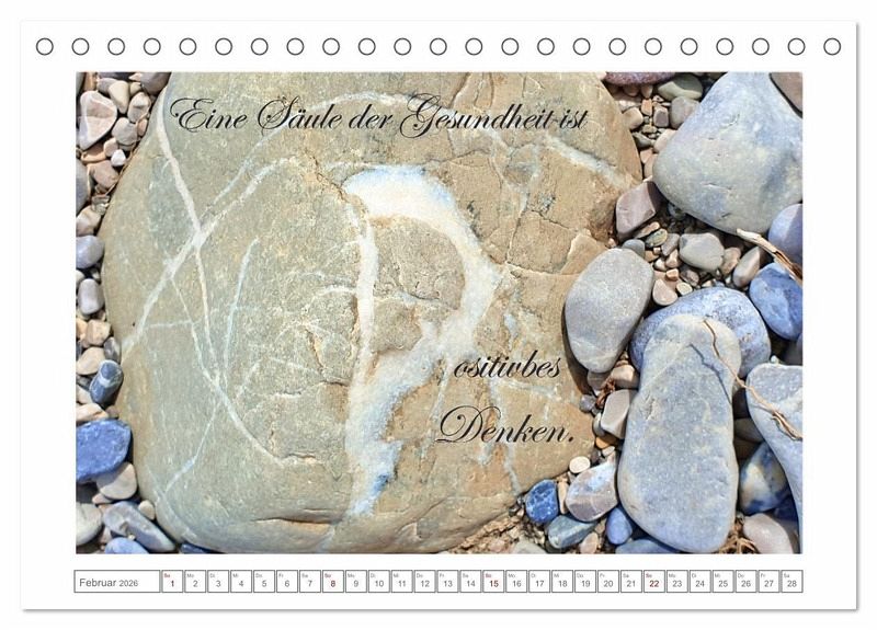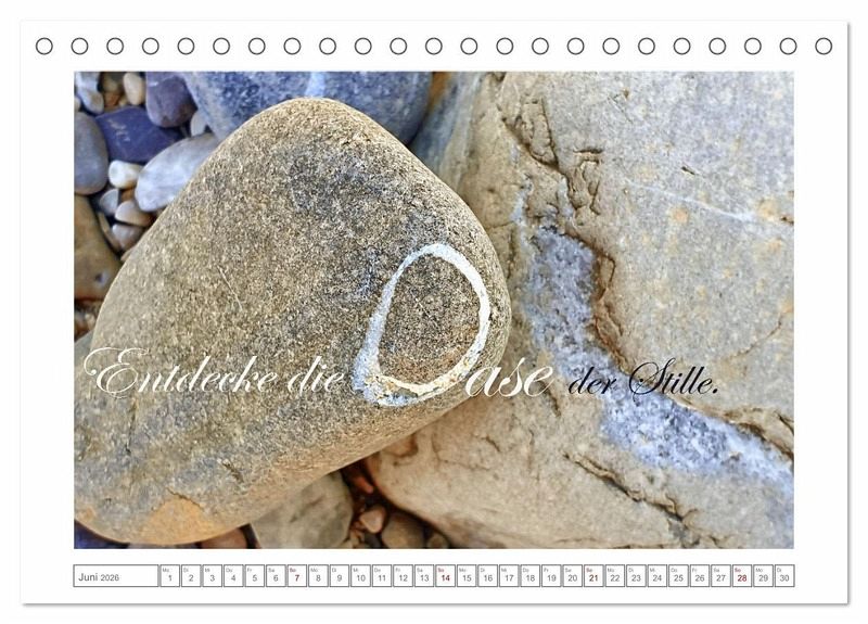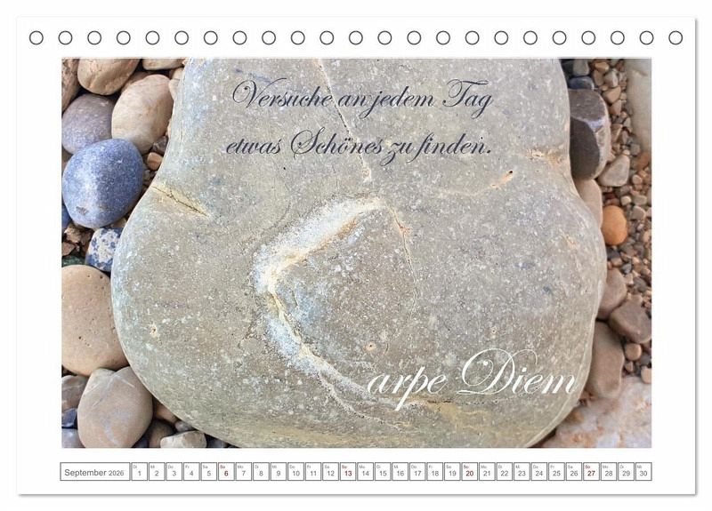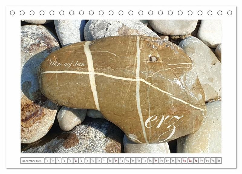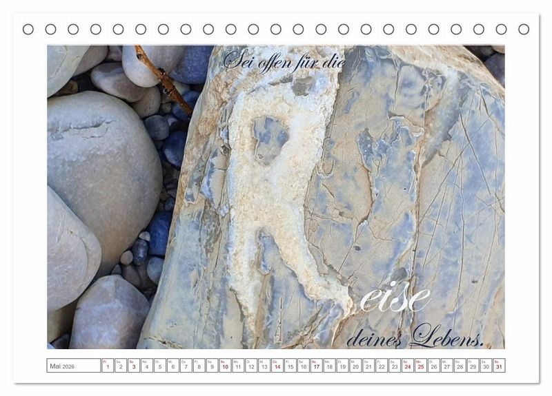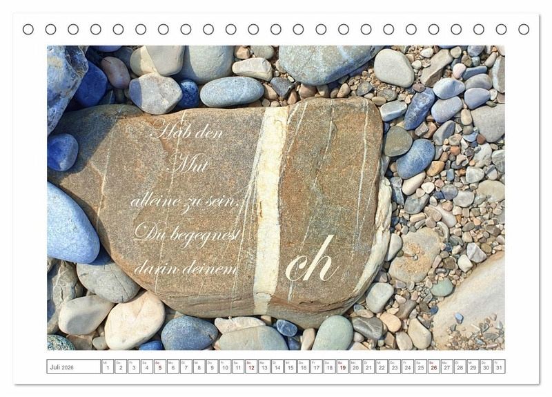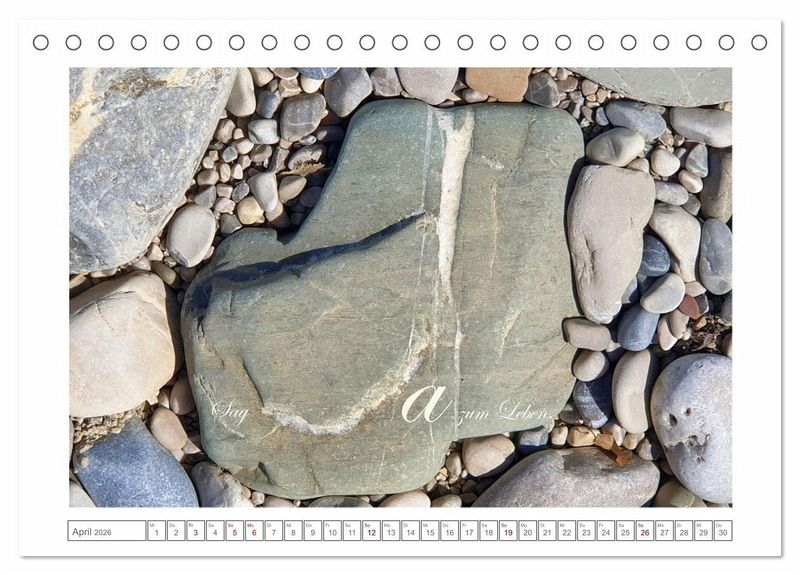 Zwölf Isarsteine deren Calcit-Adern die Form von Buchstaben haben, waren der Anfang des Kalenders. Die Buchstaben bildeten den Anfang eines Wortes. Um das Wort herum entstand ein Satz, der eine weise Botschaft zu einem glücklicheren Leben in sich trägt. Wenn alle zwölf Sätze regelmäßig praktiziert werden, gewinnt das Leben an Qualität.