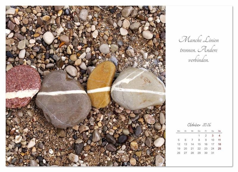 Die Steine des Lebens ist ein stiller, poetischer Kalender für Menschen, die Tiefe, Natur und achtsame Worte schätzen. Jeder Monat zeigt ein ausdrucksstarkes Steinbild. Von rau bis sanft, von geordnet bis wild, begleitet von einem kurzen Spruch, der berührt, entschleunigt und nachklingt. Es geht um Verbindung, Wandel, Prägung, Leichtigkeit, Nähe. Um das, was bleibt, wenn alles andere sich wandelt. Dieser Kalender lädt dazu ein, den eigenen Weg mit mehr Stille, Klarheit und innerem Raum zu gehen. Ein achtsamer Begleiter durch das Jahr.