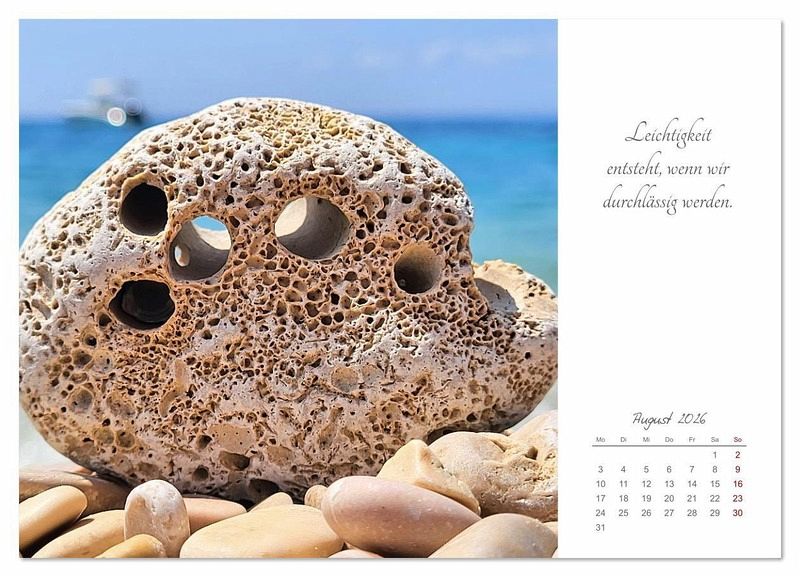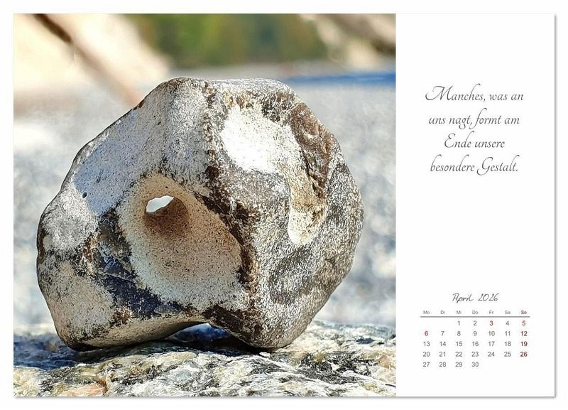 Die Steine des Lebens ist ein stiller, poetischer Kalender für Menschen, die Tiefe, Natur und achtsame Worte schätzen. Jeder Monat zeigt ein ausdrucksstarkes Steinbild. Von rau bis sanft, von geordnet bis wild, begleitet von einem kurzen Spruch, der berührt, entschleunigt und nachklingt. Es geht um Verbindung, Wandel, Prägung, Leichtigkeit, Nähe. Um das, was bleibt, wenn alles andere sich wandelt. Dieser Kalender lädt dazu ein, den eigenen Weg mit mehr Stille, Klarheit und innerem Raum zu gehen. Ein achtsamer Begleiter durch das Jahr.