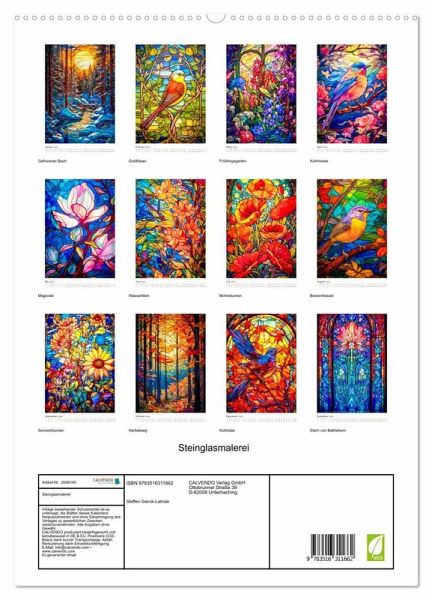 PREMIUM-LINIE - Brillanter Fotokalender mit 12 wunderschönen Motiven, Kunstdruck in Hochglanz in Museumsqualität.QUALITÄT - edle Materialien, stabile Rückwand mit 2 innovativen Einstecktaschen für eine optimale Präsentation an der Wand.NACHHALTIG - deutliche Abfallreduzierung durch bedarfsgerechte Einzelstückfertigung, umweltfreundliches FSC-zertifiziertes Papier, Produktion in Deutschland, klimabewusste Logistik.PERFEKTES GESCHENK - Kalender für Freunde und Familie, für Kinder und Erwachsene, jung und alt, zu Weihnachten, Geburtstag oder zwischendurch.Steinglasmalerei ist eine Technik der Glasgestaltung, bei der Glasstücke zusammengefügt und mit Bleifolien verbunden werden, um kunstvolle Fenster, Türen und Wandschmuck zu schaffen. von Autor(in): Steffen Gierok ; Magik Artist Design