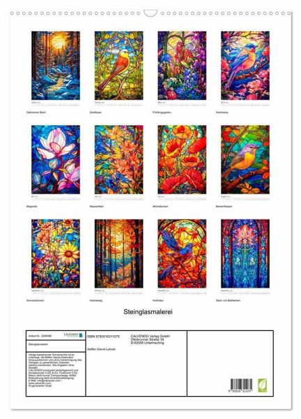 QUALITÄT - Hochwertiger Fotokalender mit 12 wunderschönen Motiven auf lichtbeständigem Bilderdruckpapier, robuste Spiralbindung mit Aufhängebügel.NACHHALTIG - deutliche Abfallreduzierung durch bedarfsgerechte Einzelstückfertigung, umweltfreundliches FSC-zertifiziertes Papier, Produktion in Deutschland, klimabewusste Logistik.PERFEKTES GESCHENK - Kalender für Freunde und Familie, für Kinder und Erwachsene, jung und alt, zu Weihnachten, Geburtstag oder zwischendurch.VIELFALT - Bildkalender in verschiedenen Formaten, z.B. DIN A5, DIN A4, DIN A3 sowie DIN A2. Ob Naturmotiv, Gemälde oder Fotos, ideal für ein persönliches Wohlfühlambiente.Steinglasmalerei ist eine Technik der Glasgestaltung, bei der Glasstücke zusammengefügt und mit Bleifolien verbunden werden, um kunstvolle Fenster, Türen und Wandschmuck zu schaffen. von Autor(in): Steffen Gierok ; Magik Artist Design